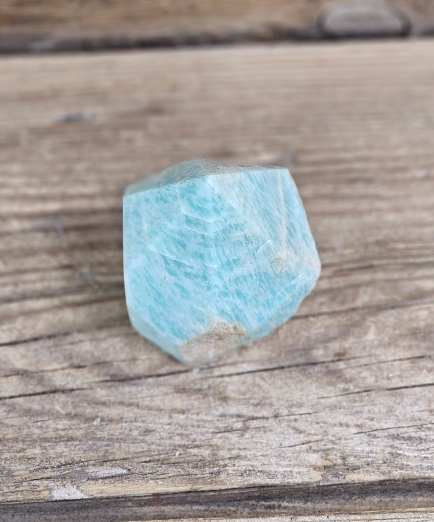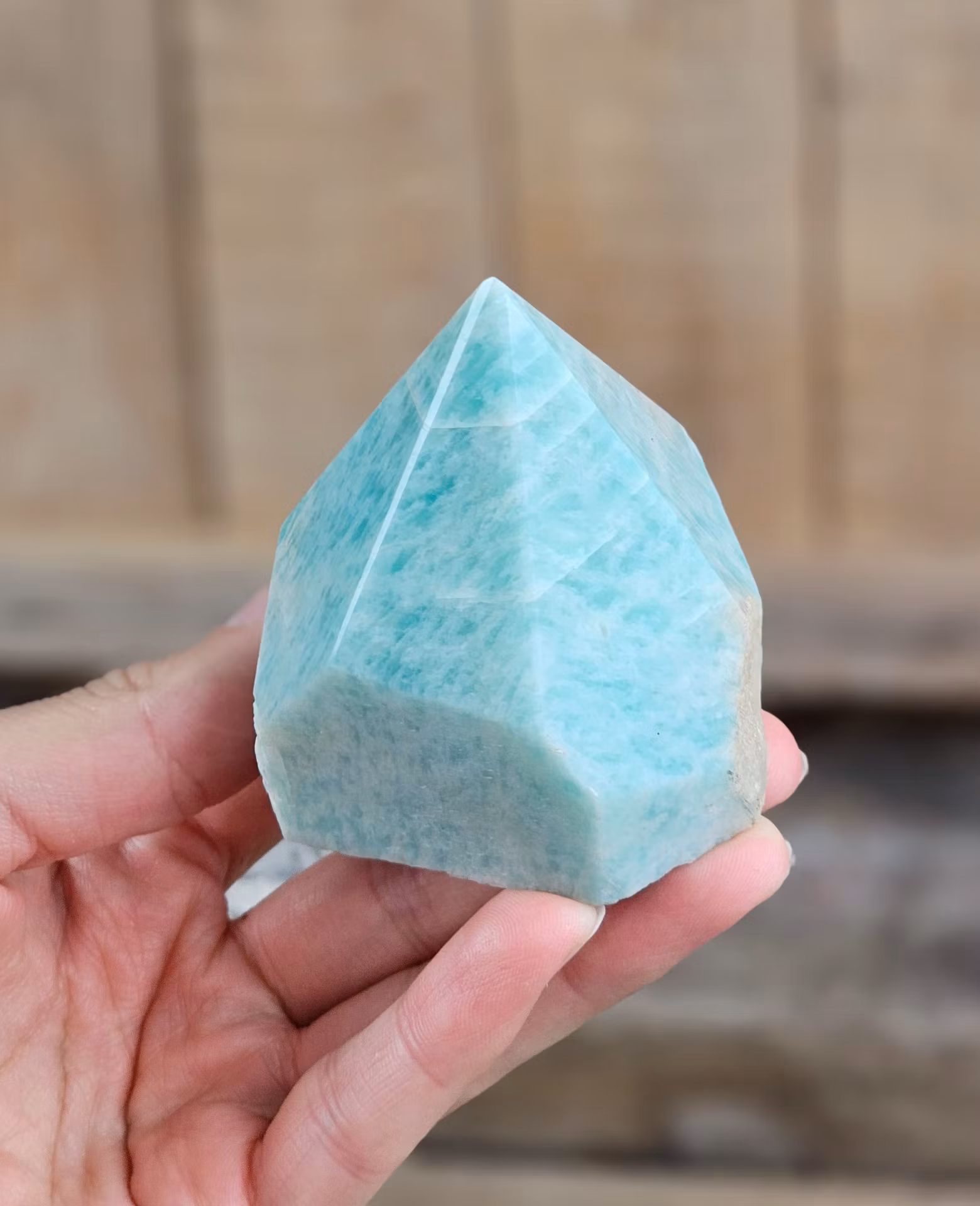 Mycket fin stående polerad spets i Amazonit. Råa sidor och slipad botten. Superhärligt exemplar med riktigt läcker färg! Tänk på att kristaller kommer från naturen & naturliga sprickor & ojämnhet kan förekomma. Färger kan skilja sig beroende på hur ljuset faller ner på kristallen samt även mellan olika bildskärmar m.m.