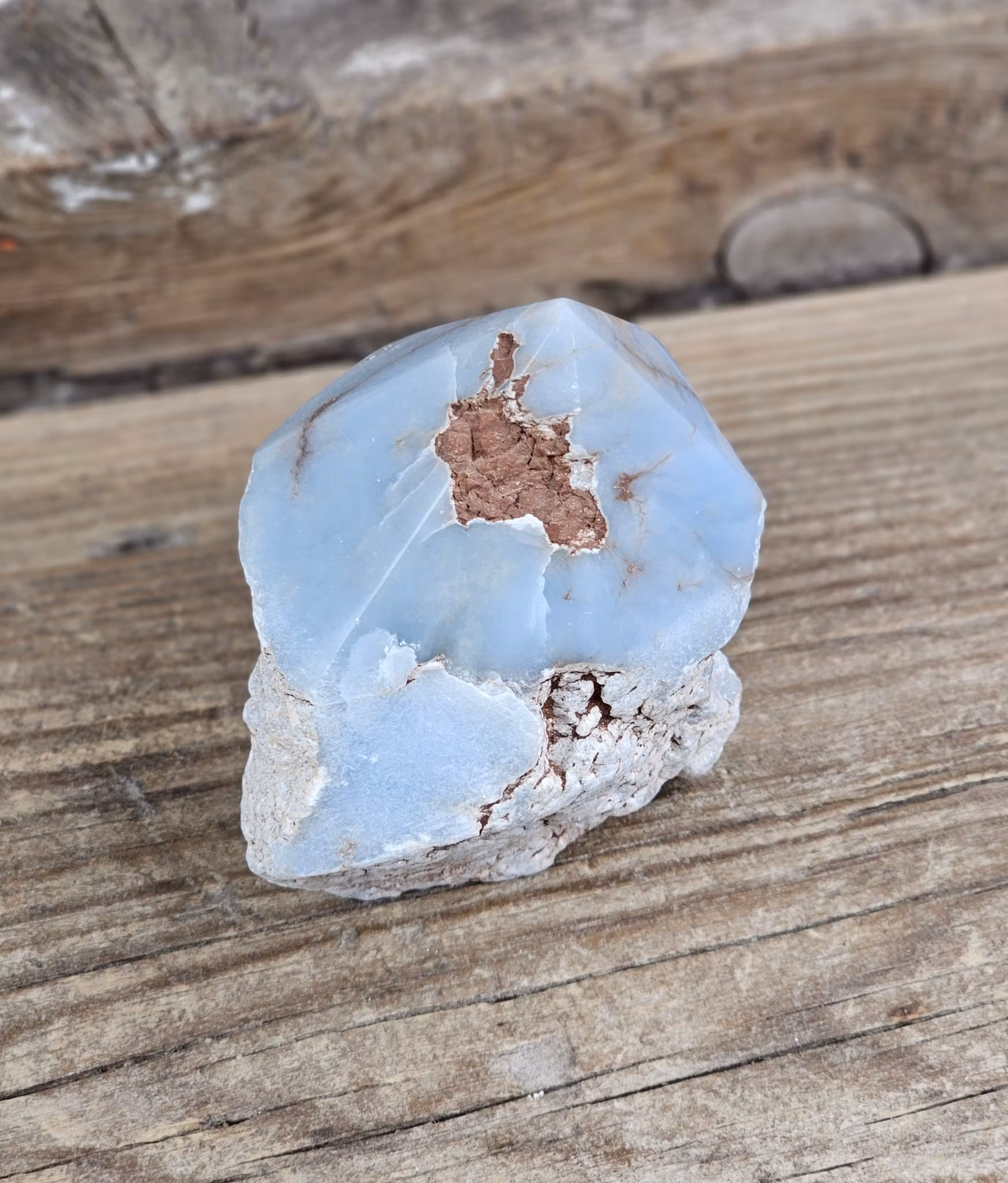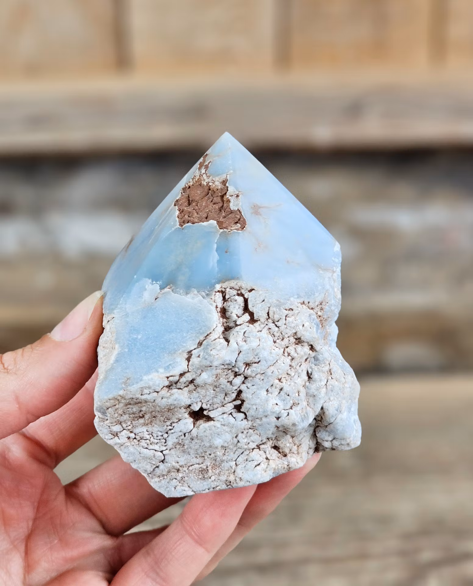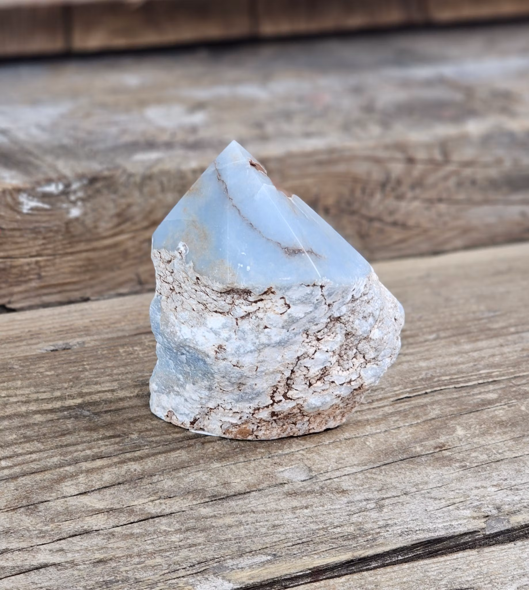 Fin stående polerad spets i Angelit, ljusare färg. Råa sidor och slipad botten. Tänk på att kristaller kommer från naturen & naturliga sprickor & ojämnhet kan förekomma. Färger kan skilja sig beroende på hur ljuset faller ner på kristallen samt även mellan olika bildskärmar m.m.
