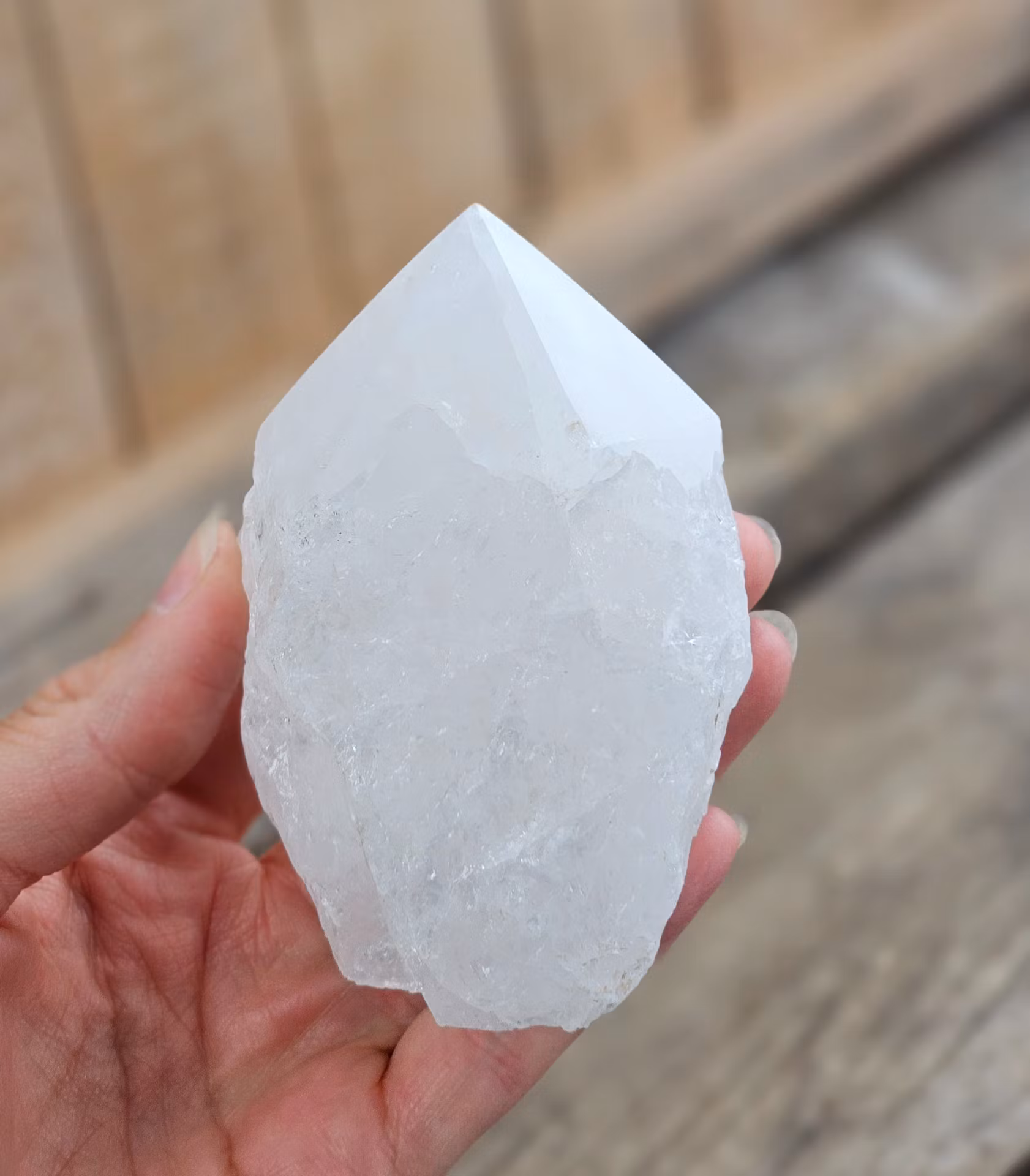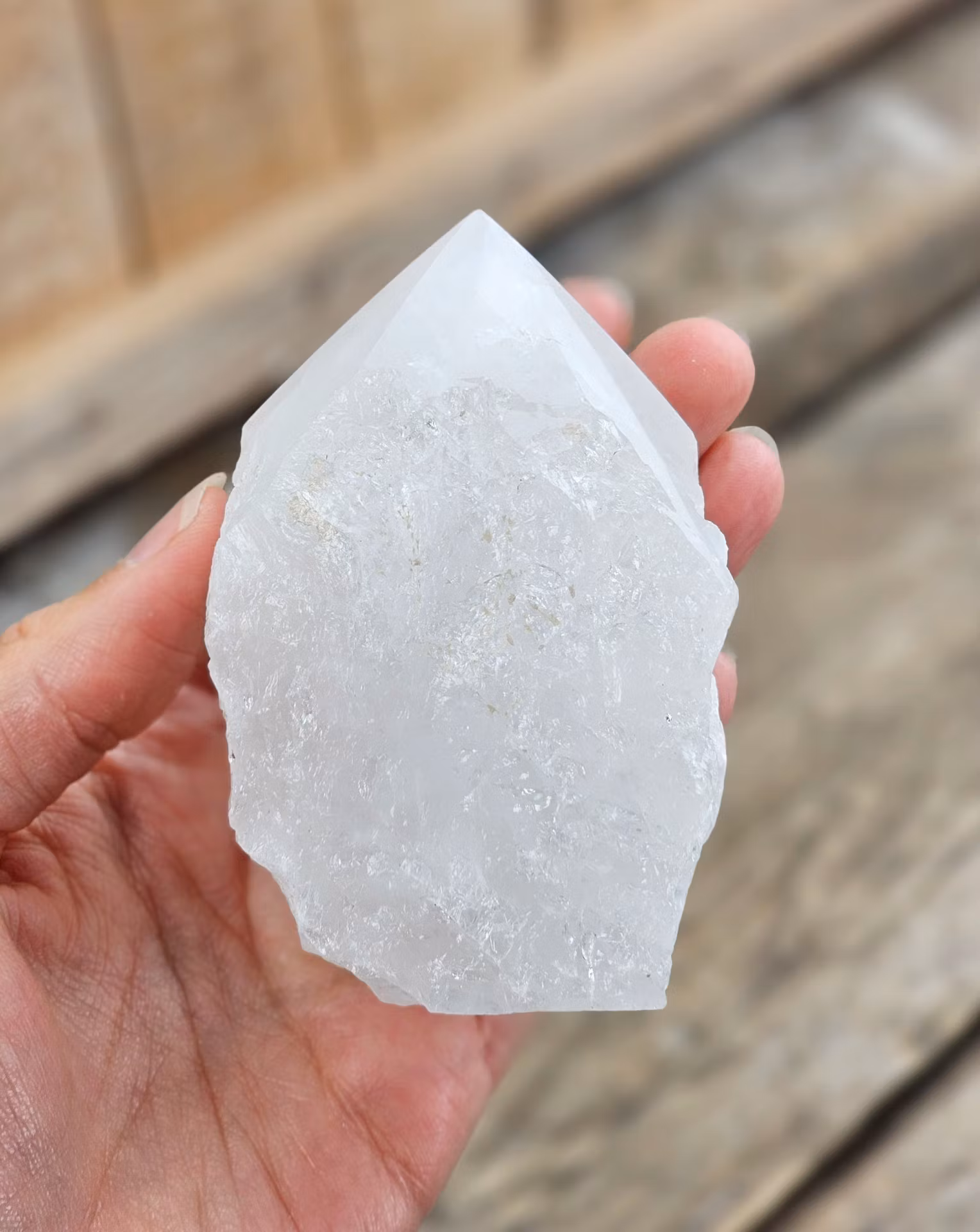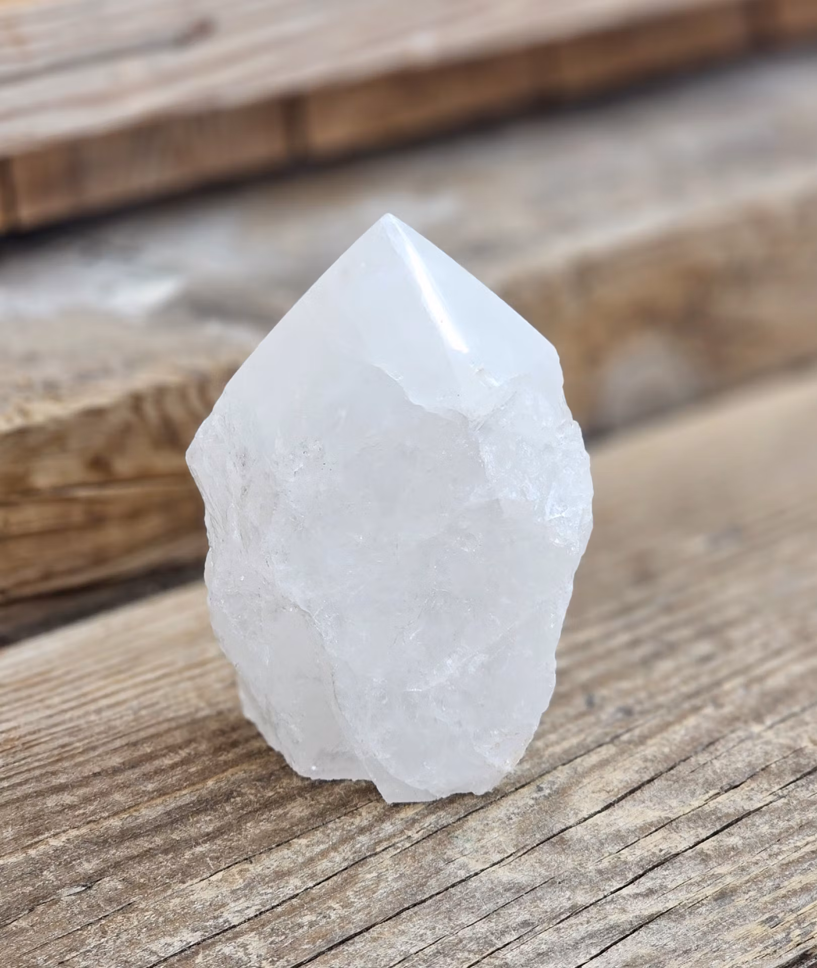 Riktigt fin stående polerad spets i Bergkristall med mjölkig/ogenomskinlig karaktär. Råa sidor. Ett härligt exemplar. Kristallen på bilderna är den du köper. Tänk på att kristaller kommer från naturen, små skillnader kan därför förekomma i produktens utseende på grund av dess naturmaterial. Färger kan skilja sig beroende på hur ljuset faller ner på kristallen samt även mellan olika bildskärmar m.m.