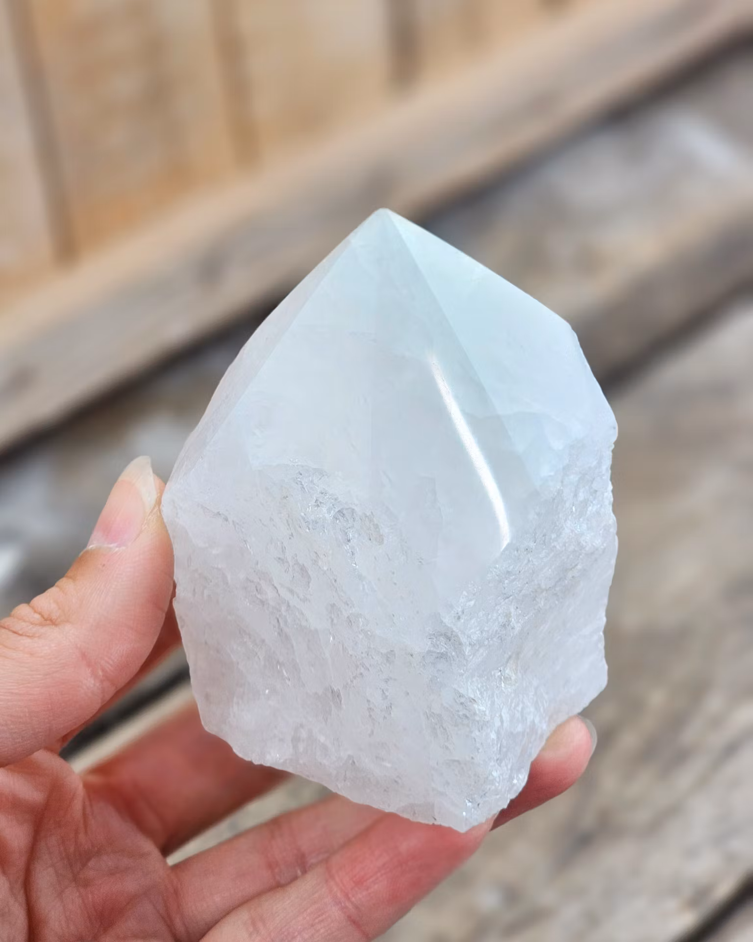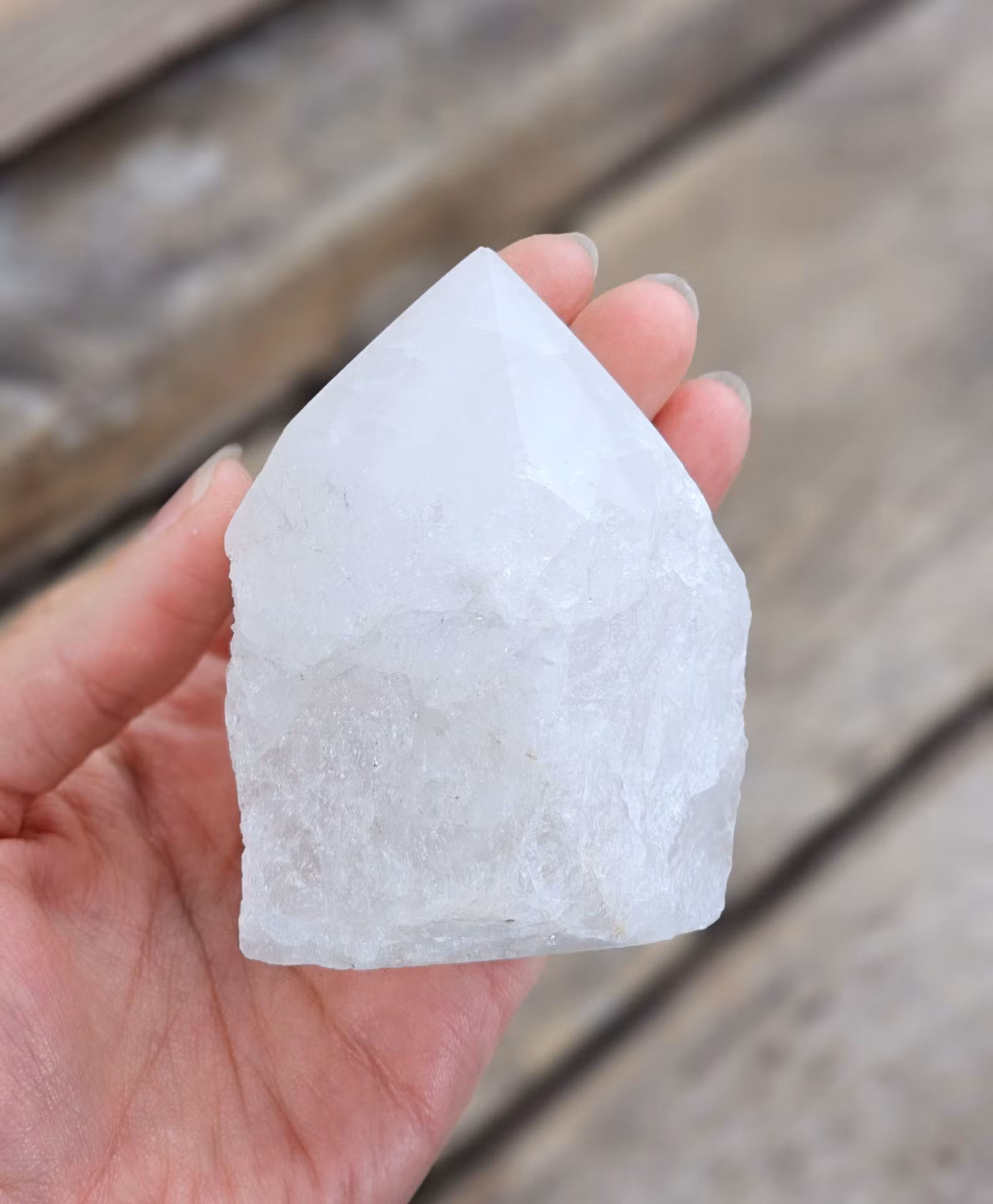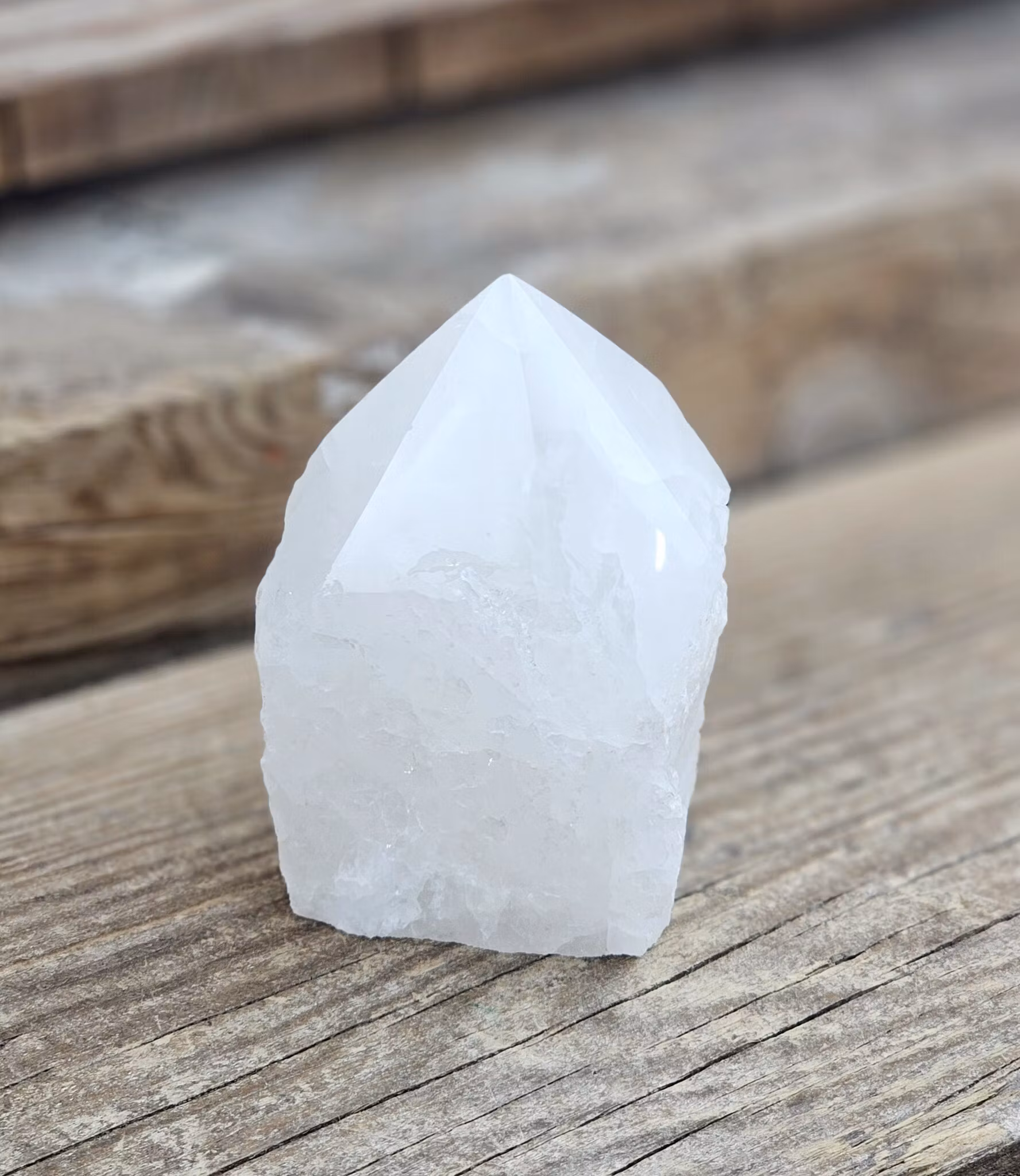 Riktigt fin stående polerad spets i Bergkristall med mjölkig/ogenomskinlig karaktär. Råa sidor. Ett härligt exemplar. Kristallen på bilderna är den du köper. Tänk på att kristaller kommer från naturen, små skillnader kan därför förekomma i produktens utseende på grund av dess naturmaterial. Färger kan skilja sig beroende på hur ljuset faller ner på kristallen samt även mellan olika bildskärmar m.m.