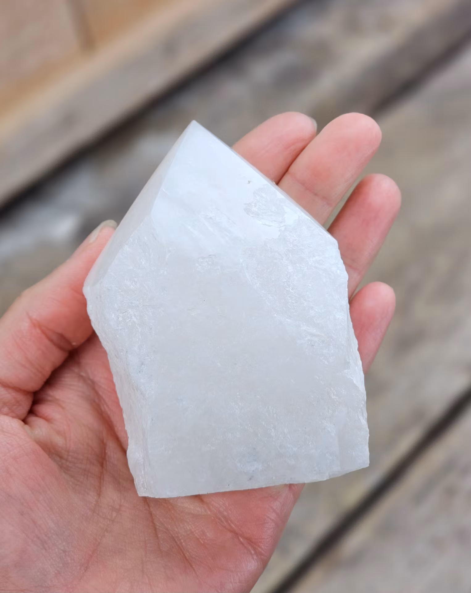 Riktigt fin stående polerad spets i Bergkristall med mjölkig/ogenomskinlig karaktär. Råa sidor. Ett härligt exemplar. Kristallen på bilderna är den du köper. Tänk på att kristaller kommer från naturen, små skillnader kan därför förekomma i produktens utseende på grund av dess naturmaterial. Färger kan skilja sig beroende på hur ljuset faller ner på kristallen samt även mellan olika bildskärmar m.m.
