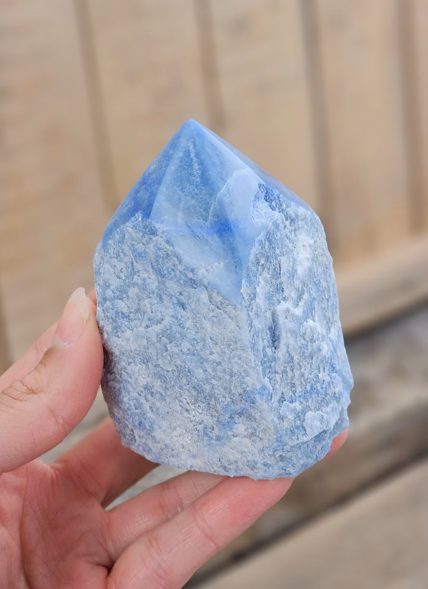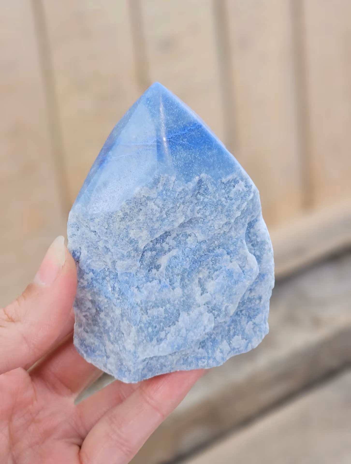 Mycket vacker stående polerad spets i Blå Kvarts med råa sidor. Superhärligt exemplar med underbar färg. Kristallen på bilderna är den du köper. Tänk på att kristaller kommer från naturen, små skillnader kan därför förekomma i produktens utseende på grund av dess naturmaterial. Färger kan skilja sig beroende på hur ljuset faller ner på kristallen samt även mellan olika bildskärmar m.m.