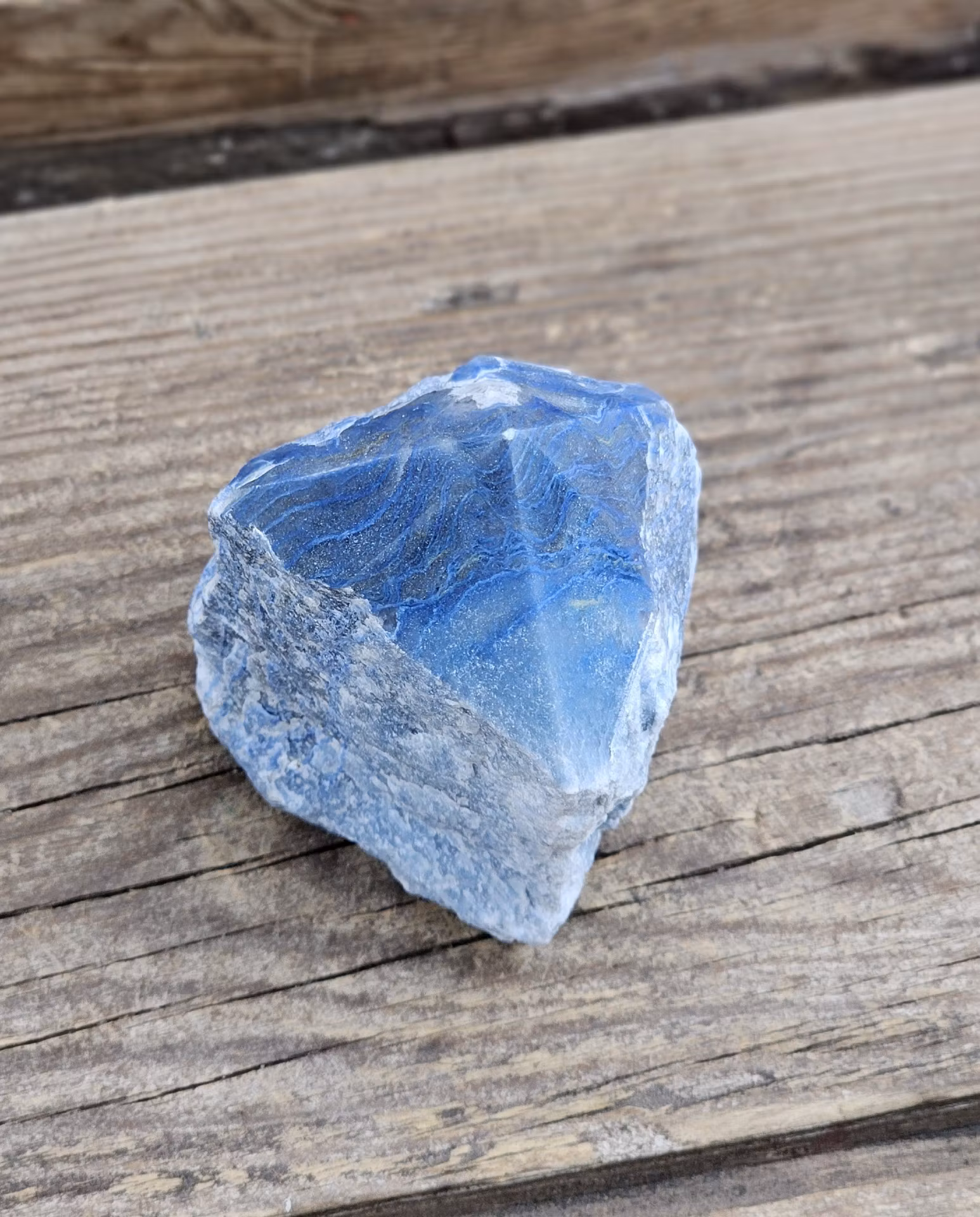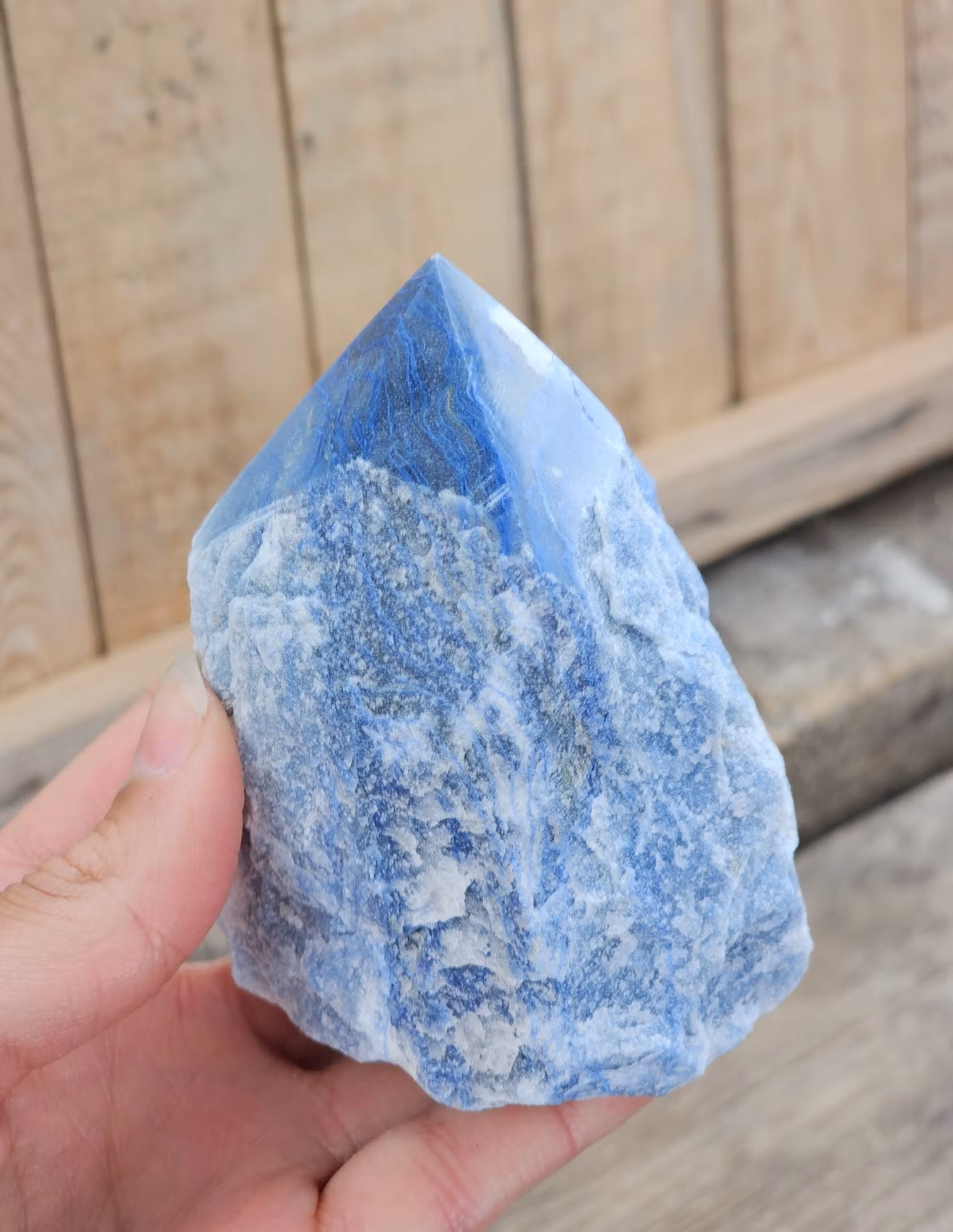 Mycket vacker stående polerad spets i Blå Kvarts med råa sidor. Superhärligt exemplar med underbar färg. Kristallen på bilderna är den du köper. Tänk på att kristaller kommer från naturen, små skillnader kan därför förekomma i produktens utseende på grund av dess naturmaterial. Färger kan skilja sig beroende på hur ljuset faller ner på kristallen samt även mellan olika bildskärmar m.m.