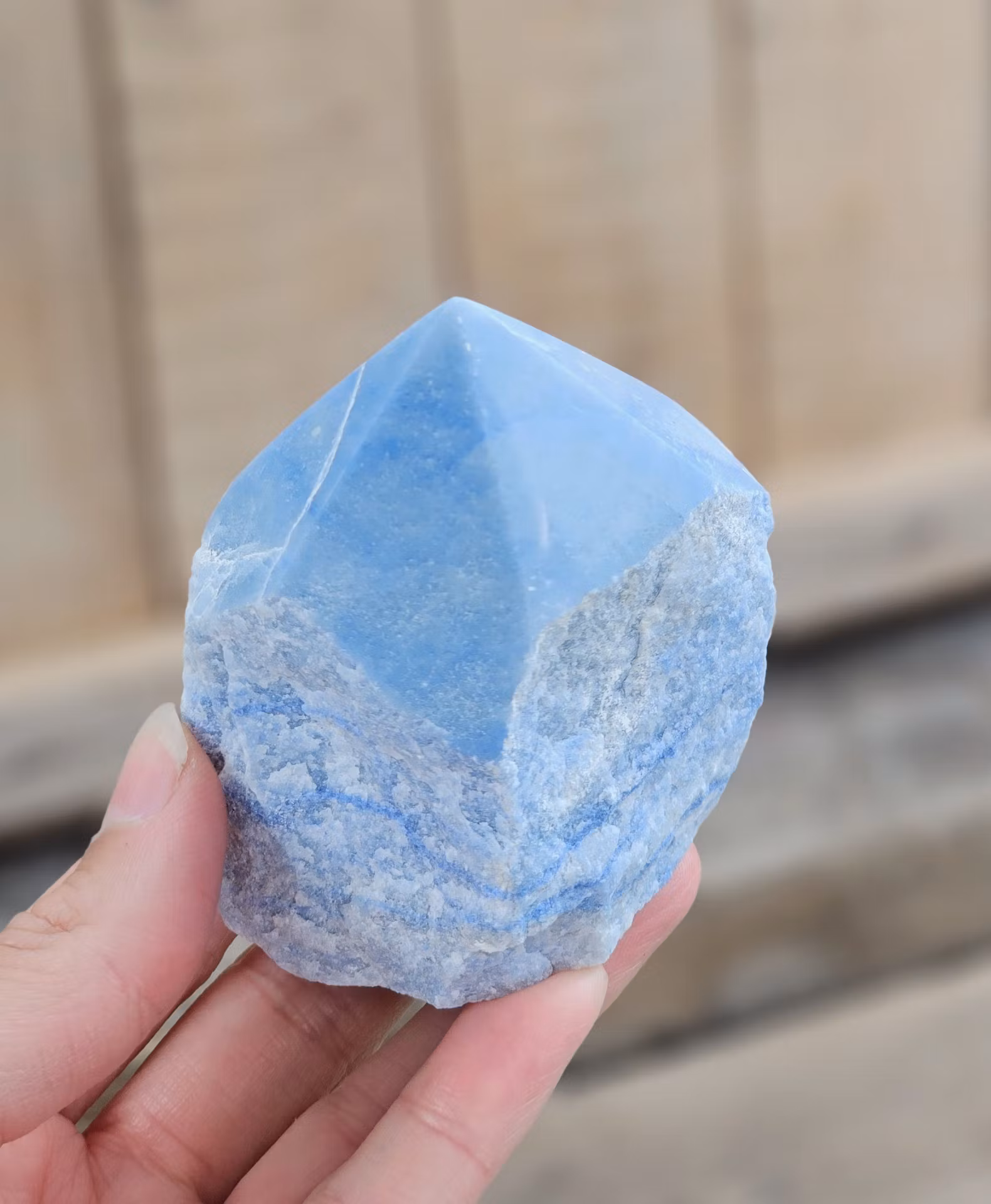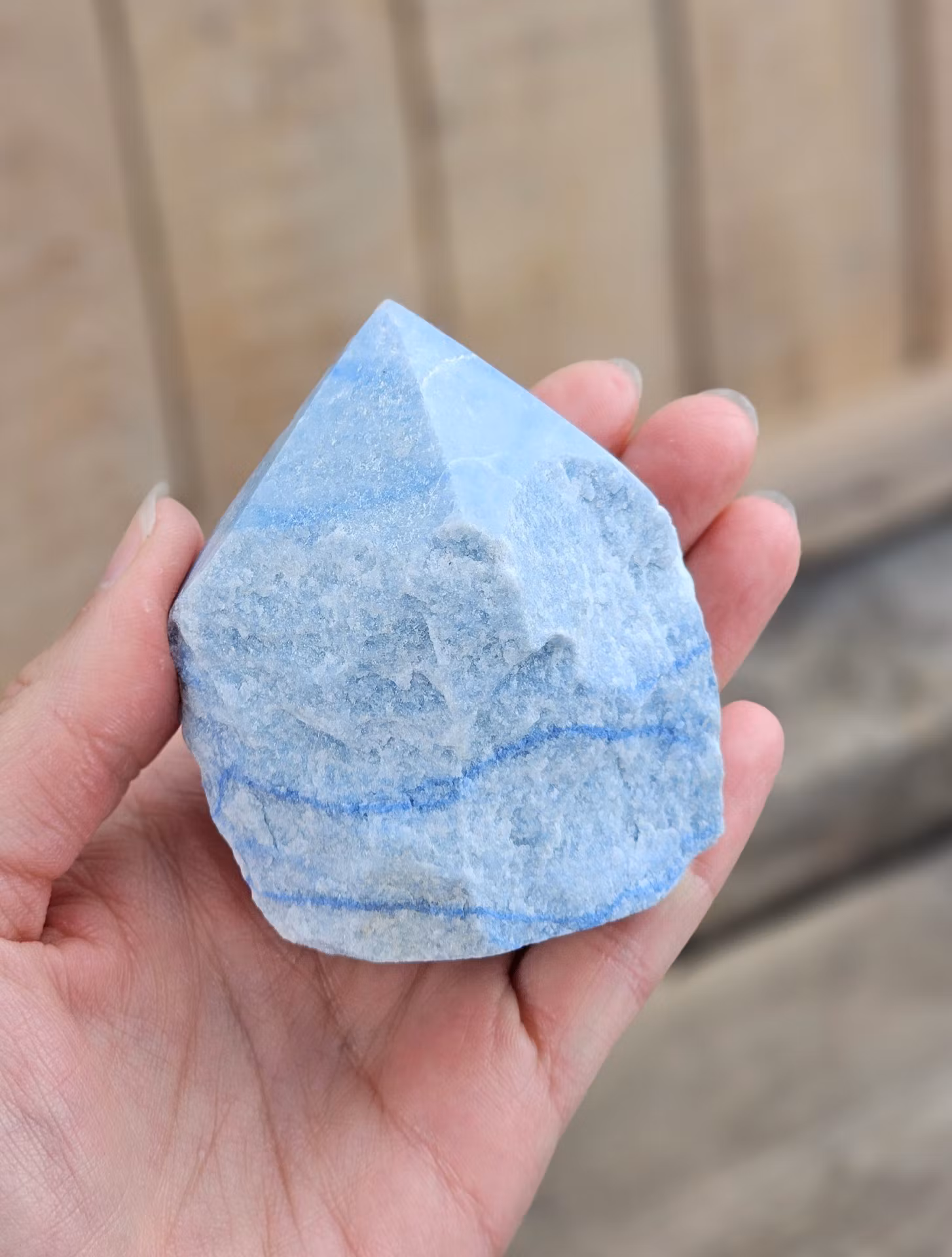 Mycket vacker stående polerad spets i Blå Kvarts med råa sidor. Superhärligt exemplar med underbar färg. Kristallen på bilderna är den du köper. Tänk på att kristaller kommer från naturen, små skillnader kan därför förekomma i produktens utseende på grund av dess naturmaterial. Färger kan skilja sig beroende på hur ljuset faller ner på kristallen samt även mellan olika bildskärmar m.m.