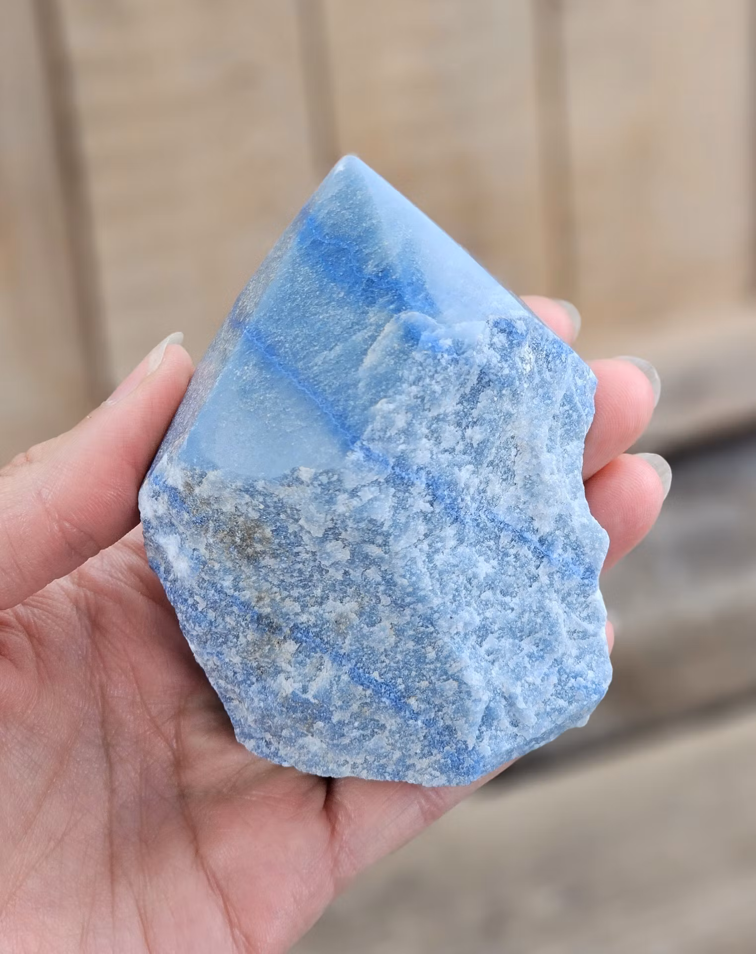 Mycket vacker stående polerad spets i Blå Kvarts med råa sidor. Superhärligt exemplar med underbar färg. Kristallen på bilderna är den du köper. Tänk på att kristaller kommer från naturen, små skillnader kan därför förekomma i produktens utseende på grund av dess naturmaterial. Färger kan skilja sig beroende på hur ljuset faller ner på kristallen samt även mellan olika bildskärmar m.m.