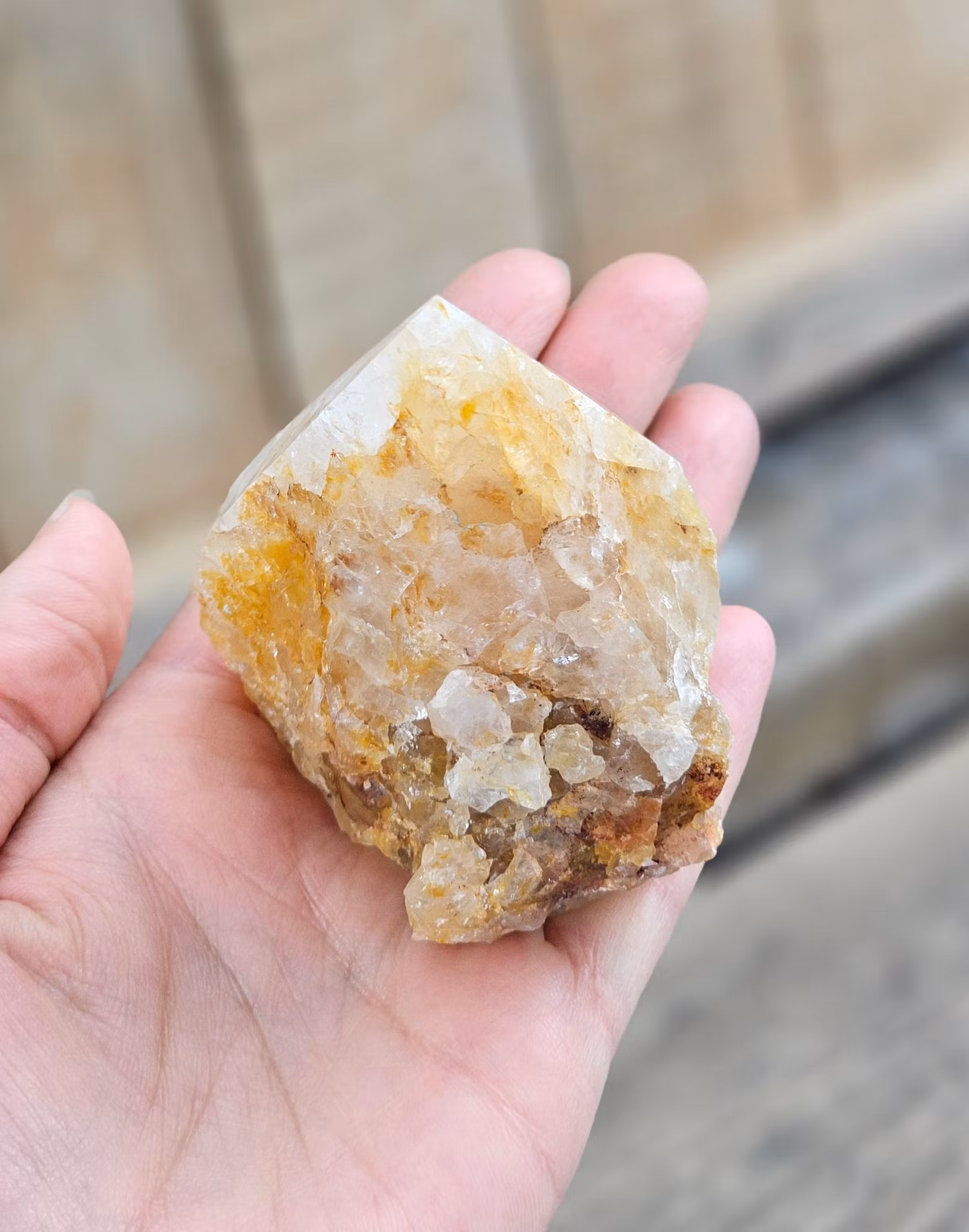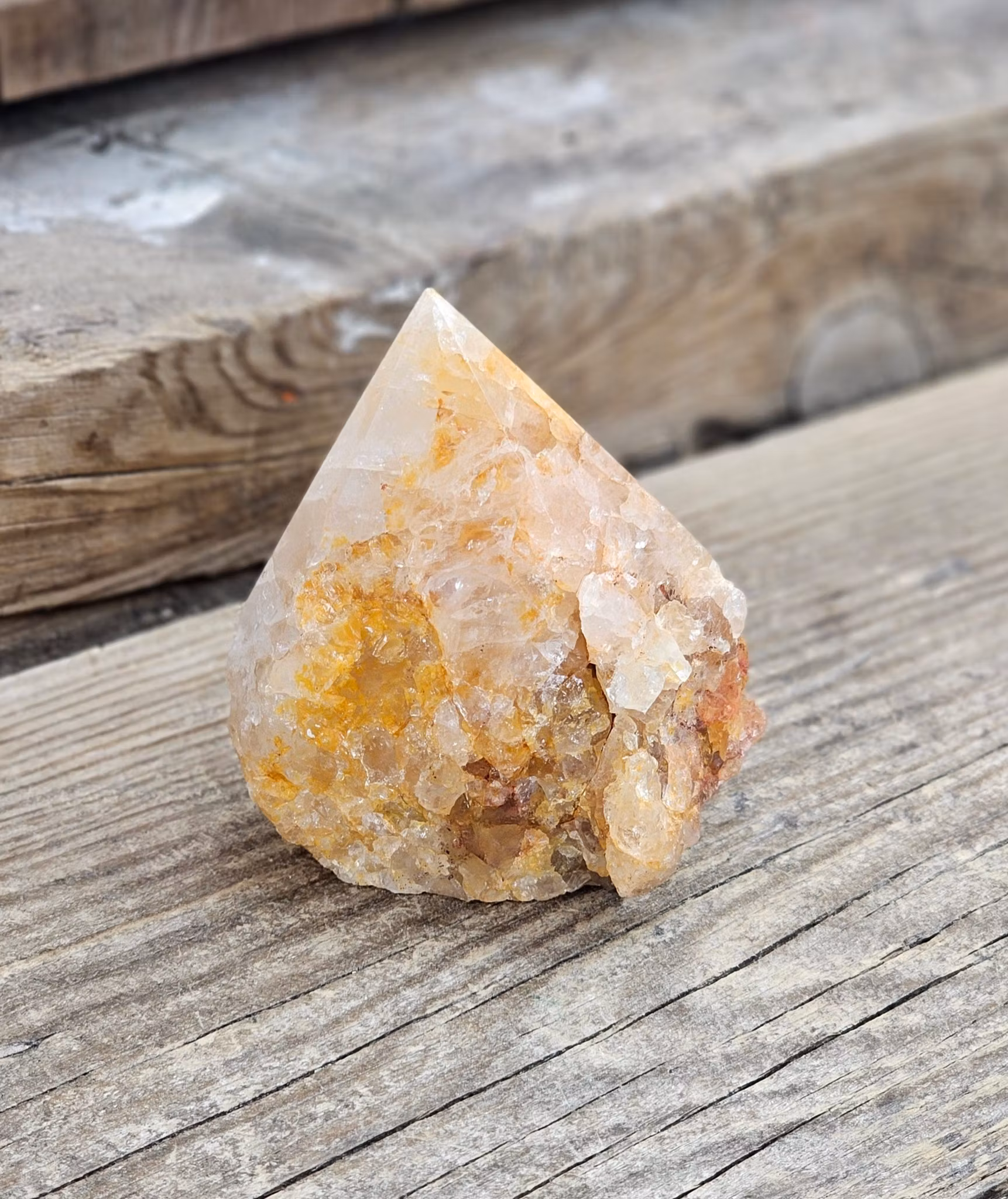 Mycket vacker stående polerad spets i Golden Healer med råa sidor. Superhärligt exemplar! Kristallen på bilderna är den du köper. Tänk på att kristaller kommer från naturen, små skillnader kan därför förekomma i produktens utseende på grund av dess naturmaterial. Färger kan skilja sig beroende på hur ljuset faller ner på kristallen samt även mellan olika bildskärmar m.m.