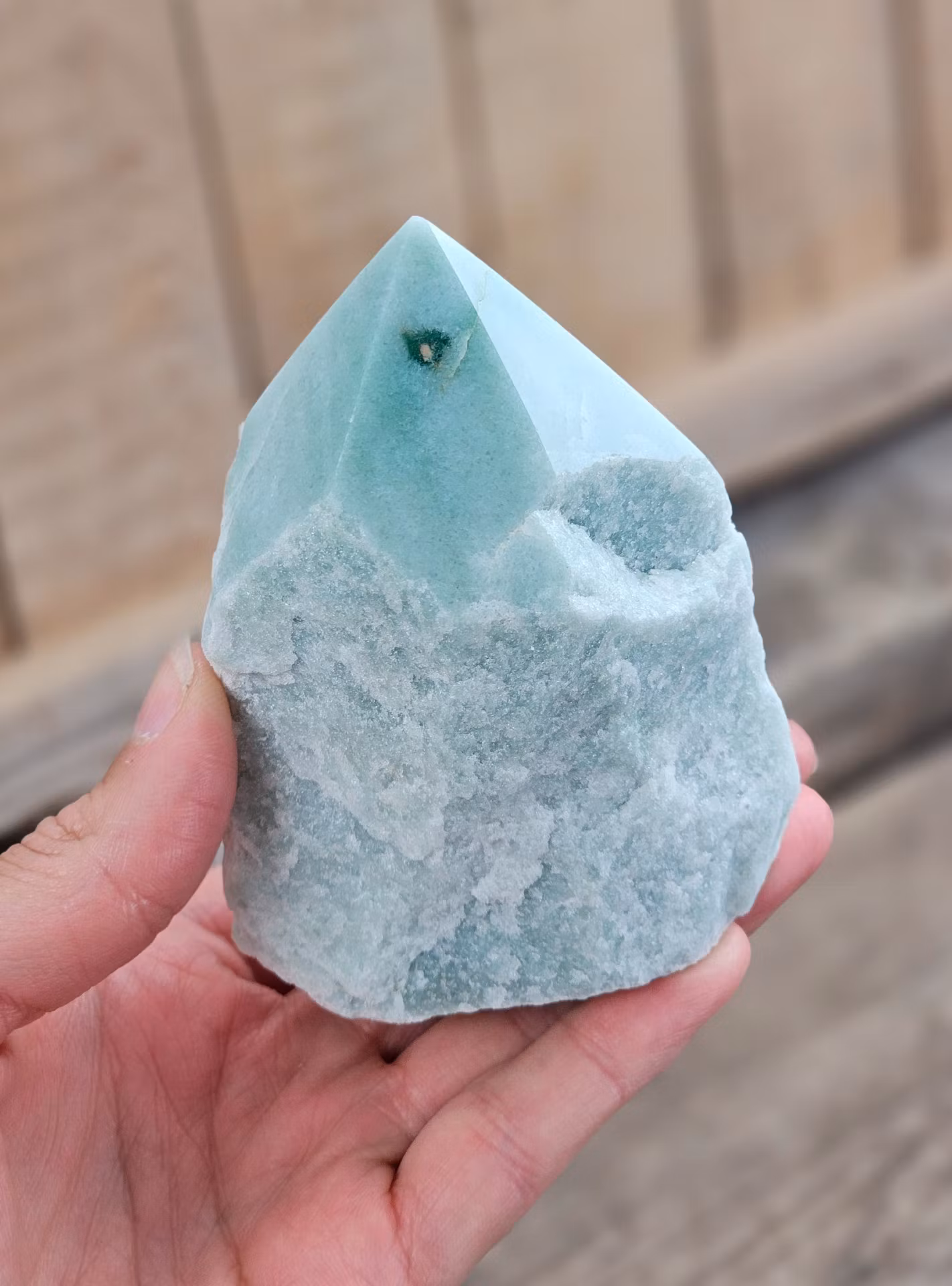 Mycket vacker stående polerad spets i Grön Aventurin med råa sidor. Superhärligt exemplar. Kristallen på bilderna är den du köper. Tänk på att kristaller kommer från naturen, små skillnader kan därför förekomma i produktens utseende på grund av dess naturmaterial. Färger kan skilja sig beroende på hur ljuset faller ner på kristallen samt även mellan olika bildskärmar m.m.