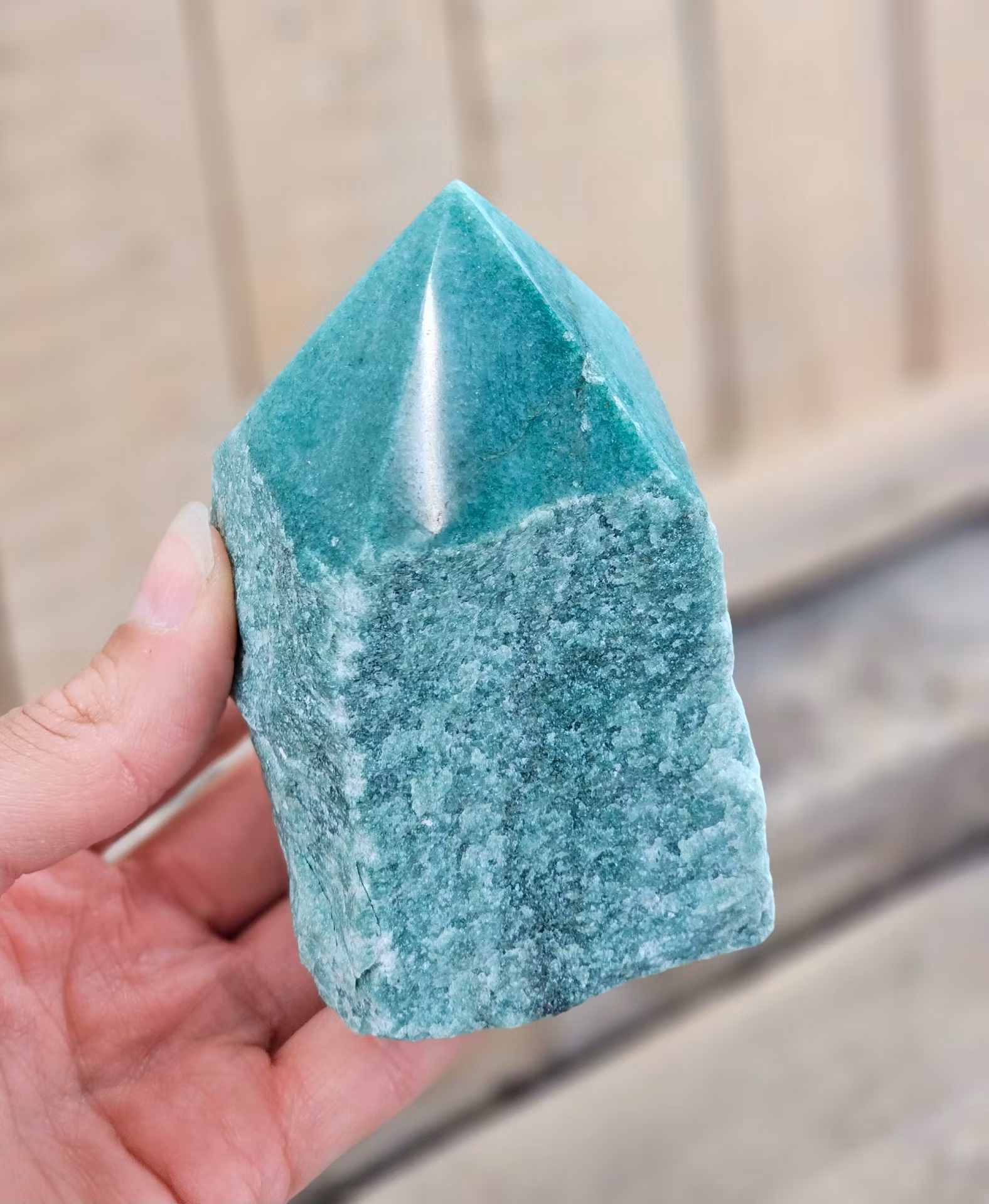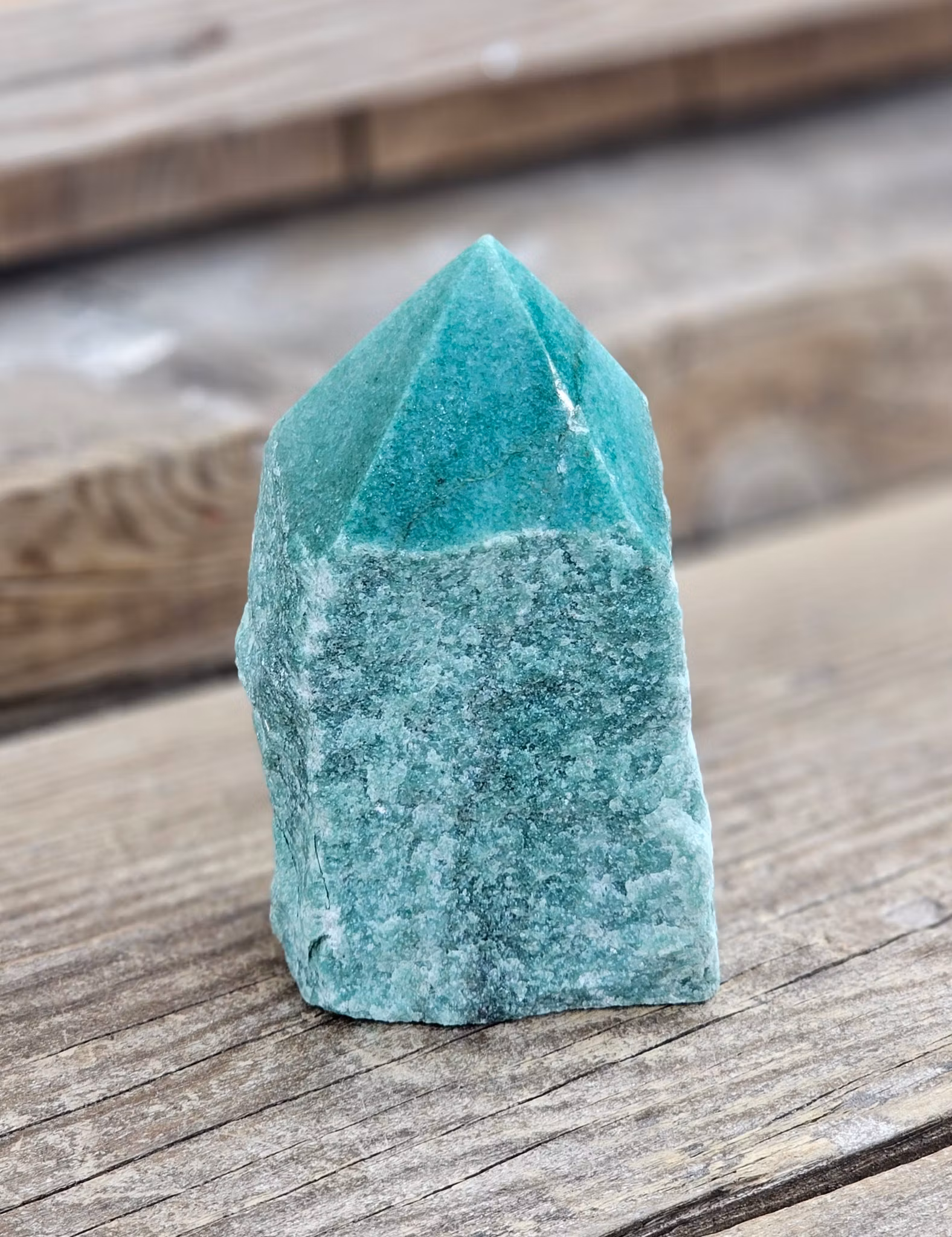 Mycket vacker stående polerad spets i Grön Aventurin med råa sidor. Superhärligt exemplar. Kristallen på bilderna är den du köper. Tänk på att kristaller kommer från naturen, små skillnader kan därför förekomma i produktens utseende på grund av dess naturmaterial. Färger kan skilja sig beroende på hur ljuset faller ner på kristallen samt även mellan olika bildskärmar m.m.