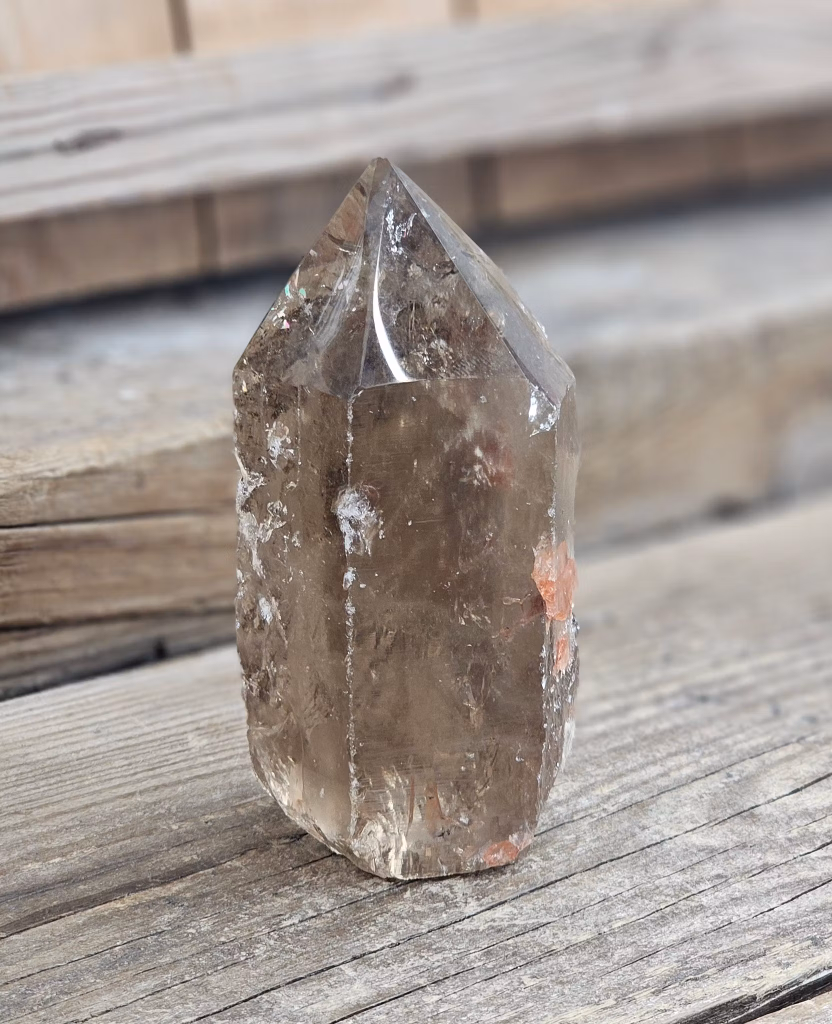 Observera att det finns ett nagg i spetsen. Därav prissänkt med -30% från ordinarie pris. Underbar stående polerad spets i Rökkvarts. Råa sidor och slipad botten. Superhärligt exemplar. Detta exemplar är även perfekt att ställa på en ljusplatta och låta hela kristallen lysa upp (ljusplatta säljes separat i vår butik). Kristallen på bilderna är den du köper. Tänk på att kristaller kommer från naturen, små skillnader kan därför förekomma i produktens utseende på grund av dess naturmaterial. Färger kan skilja sig beroende på hur ljuset faller ner på kristallen samt även mellan olika bildskärmar m.m.