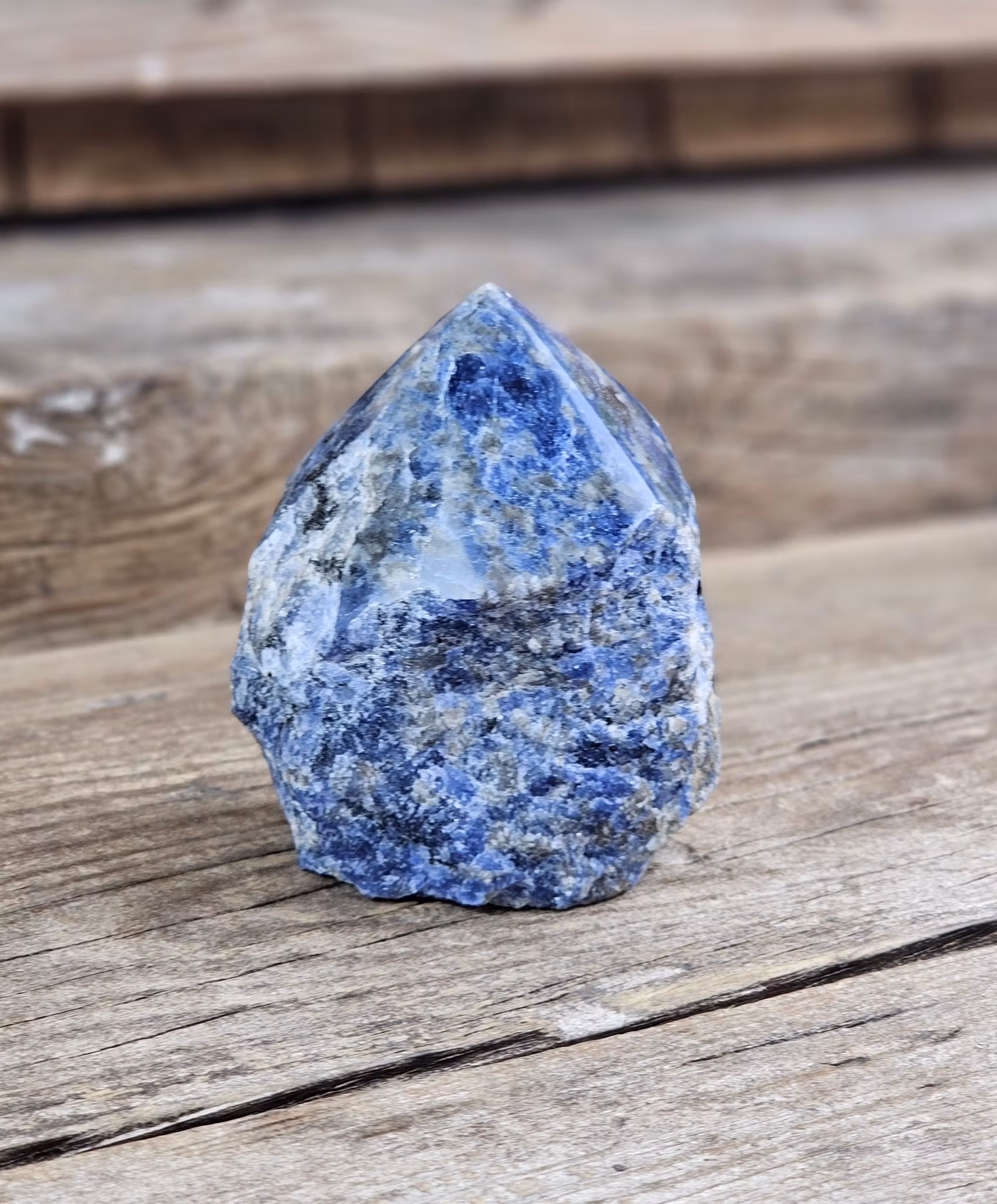 Mycket fin stående polerad spets i Sodalit med råa sidor. Kristallen på bilderna är den du köper. Tänk på att kristaller kommer från naturen, små skillnader kan därför förekomma i produktens utseende på grund av dess naturmaterial. Färger kan skilja sig beroende på hur ljuset faller ner på kristallen samt även mellan olika bildskärmar m.m.