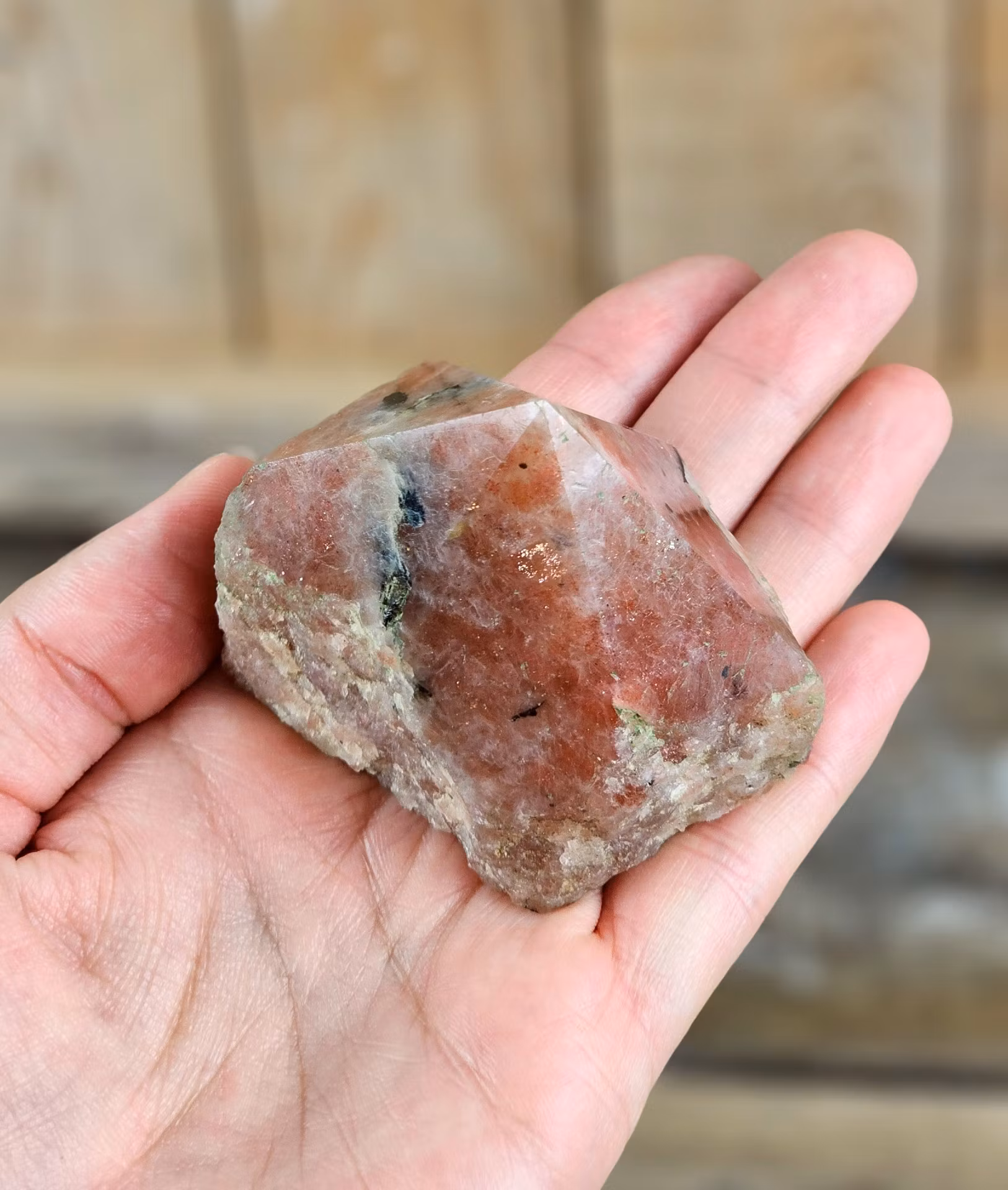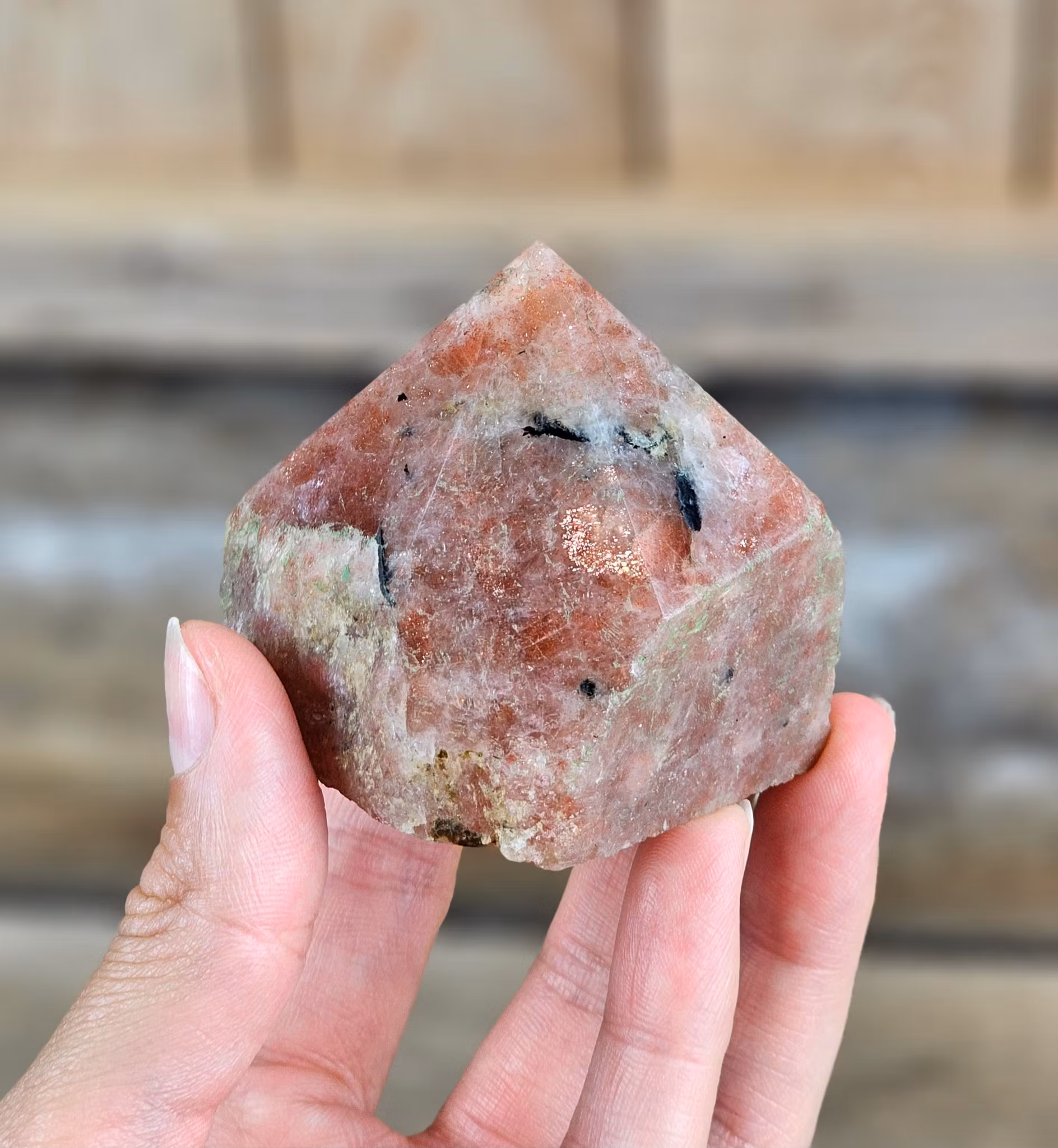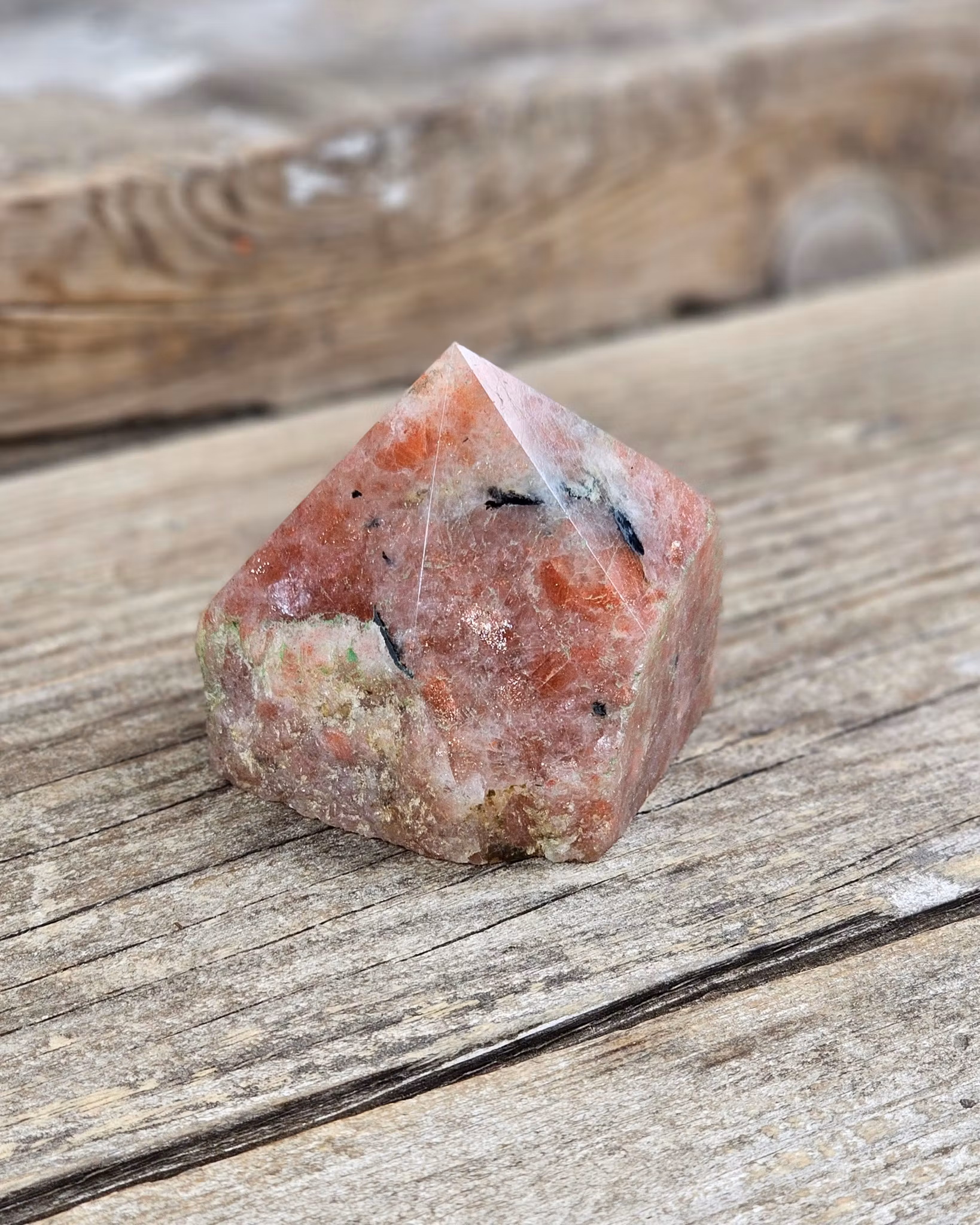 Jättefin stående polerad spets i Solsten. Råa sidor och slipad botten. Superhärligt exemplar! Tänk på att kristaller kommer från naturen & naturliga sprickor & ojämnhet kan förekomma. Färger kan skilja sig beroende på hur ljuset faller ner på kristallen samt även mellan olika bildskärmar m.m.