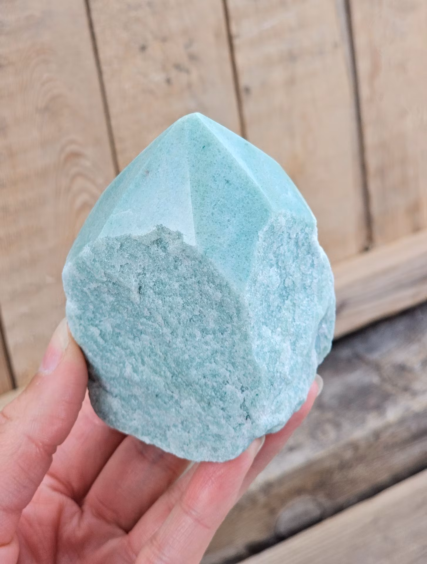 Mycket vacker stående polerad spets i Grön Aventurin med råa sidor. Superhärligt exemplar. Kristallen på bilderna är den du köper. Tänk på att kristaller kommer från naturen, små skillnader kan därför förekomma i produktens utseende på grund av dess naturmaterial. Färger kan skilja sig beroende på hur ljuset faller ner på kristallen samt även mellan olika bildskärmar m.m.