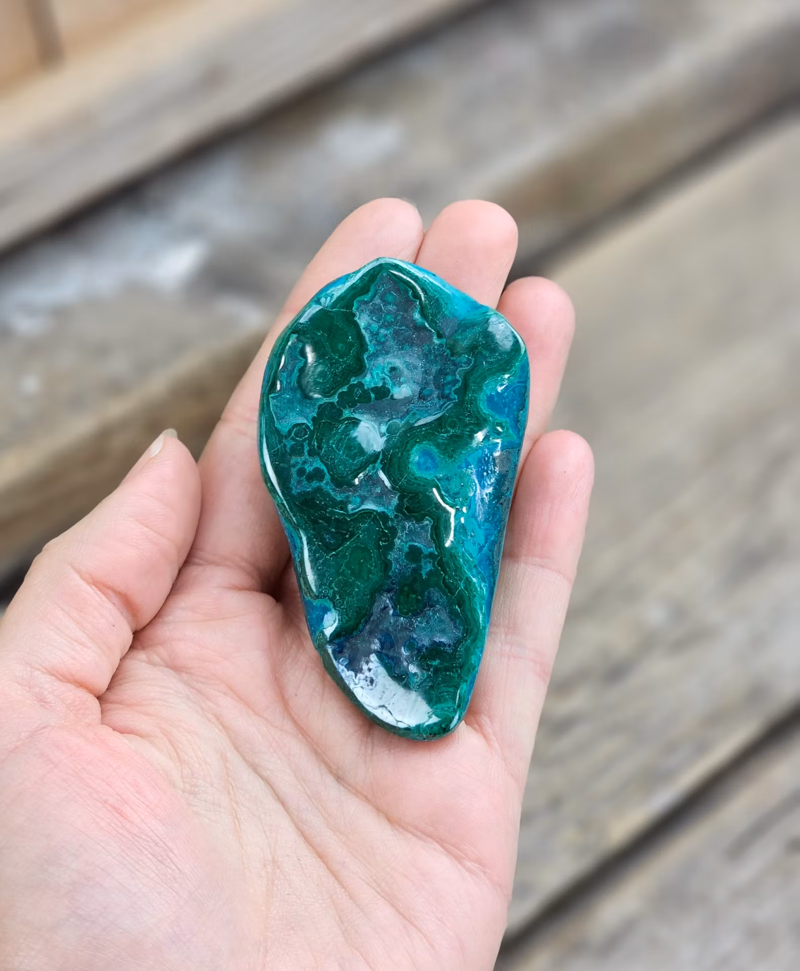 Malakolla är en exceptionell kristall som består av en kombination av de fantastiska kristallerna Malakit och Krysokolla. Ett sammansatt mineral bildat av kombinationen av Malakit (grönt kopparkarbonat) och Krysokolla (blågrönt kopparsilikat). Denna variant bildas i kopparrika miljöer genom vittring och oxidation av kopparmalmer. När kopparmineraler bryts ner kristalliseras dessa varianter tillsammans, ofta i torra eller halvtorra områden, gynnsamma förhållanden tillåter båda mineralerna att växa tillsammans. Det resulterande materialet har en unik blandning av naturliga blå och gröna nyanser med slående mönster. Malakolla är högt eftertraktad och en mer sällsynt sten, en mycket tilltalande kombination med underbara färger.