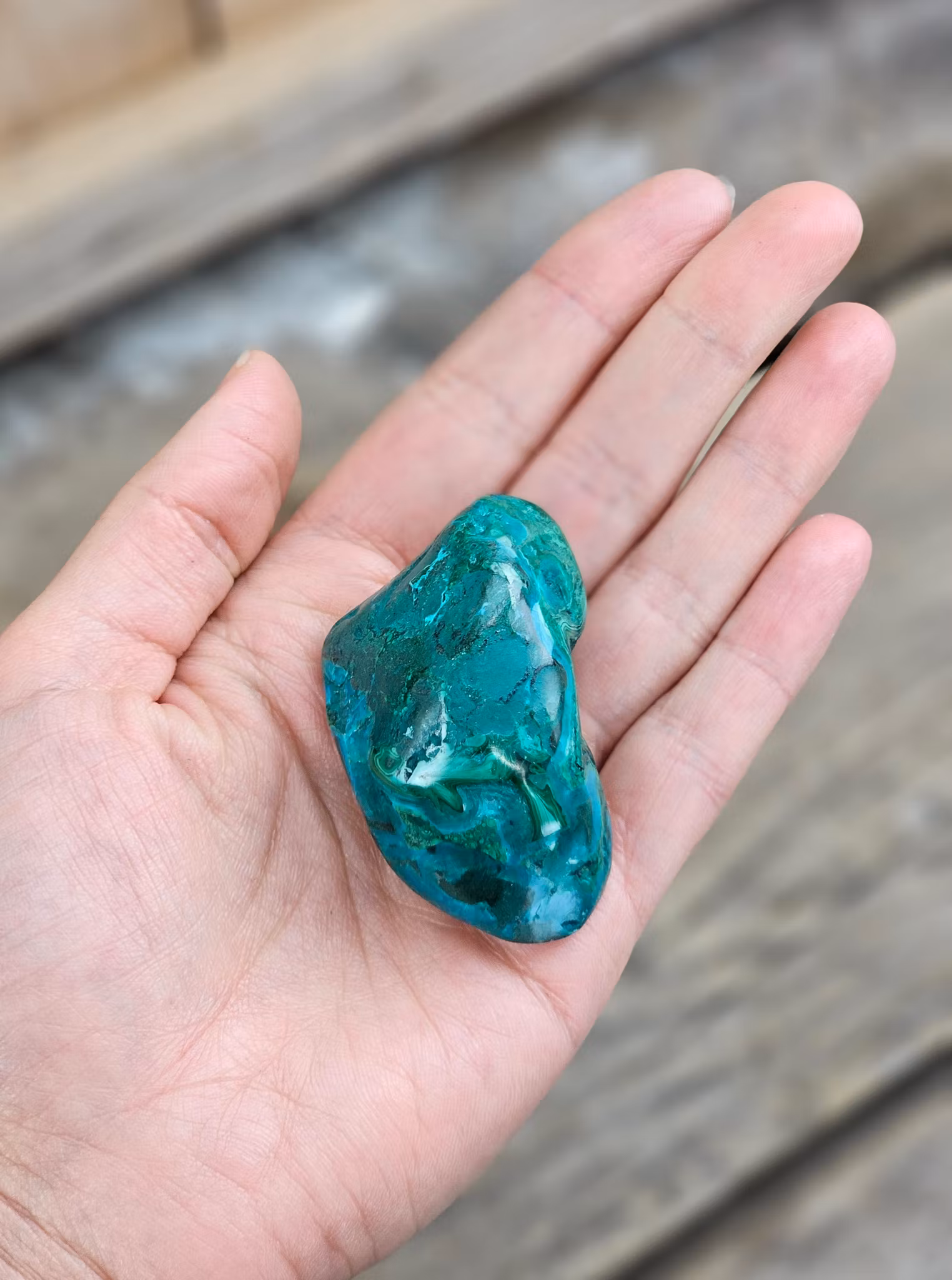 Malakolla är en exceptionell kristall som består av en kombination av de fantastiska kristallerna Malakit och Krysokolla. Ett sammansatt mineral bildat av kombinationen av Malakit (grönt kopparkarbonat) och Krysokolla (blågrönt kopparsilikat). Denna variant bildas i kopparrika miljöer genom vittring och oxidation av kopparmalmer. När kopparmineraler bryts ner kristalliseras dessa varianter tillsammans, ofta i torra eller halvtorra områden, gynnsamma förhållanden tillåter båda mineralerna att växa tillsammans. Det resulterande materialet har en unik blandning av naturliga blå och gröna nyanser med slående mönster. Malakolla är högt eftertraktad och en mer sällsynt sten, en mycket tilltalande kombination med underbara färger.