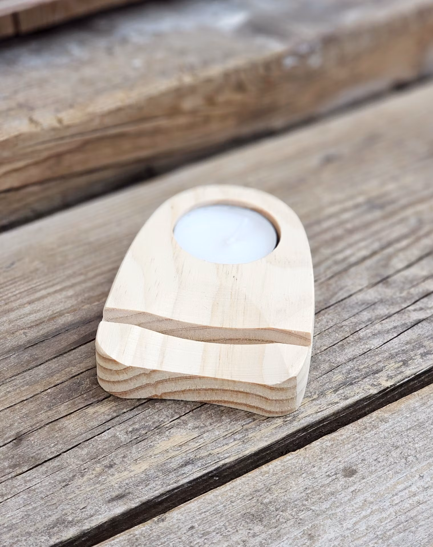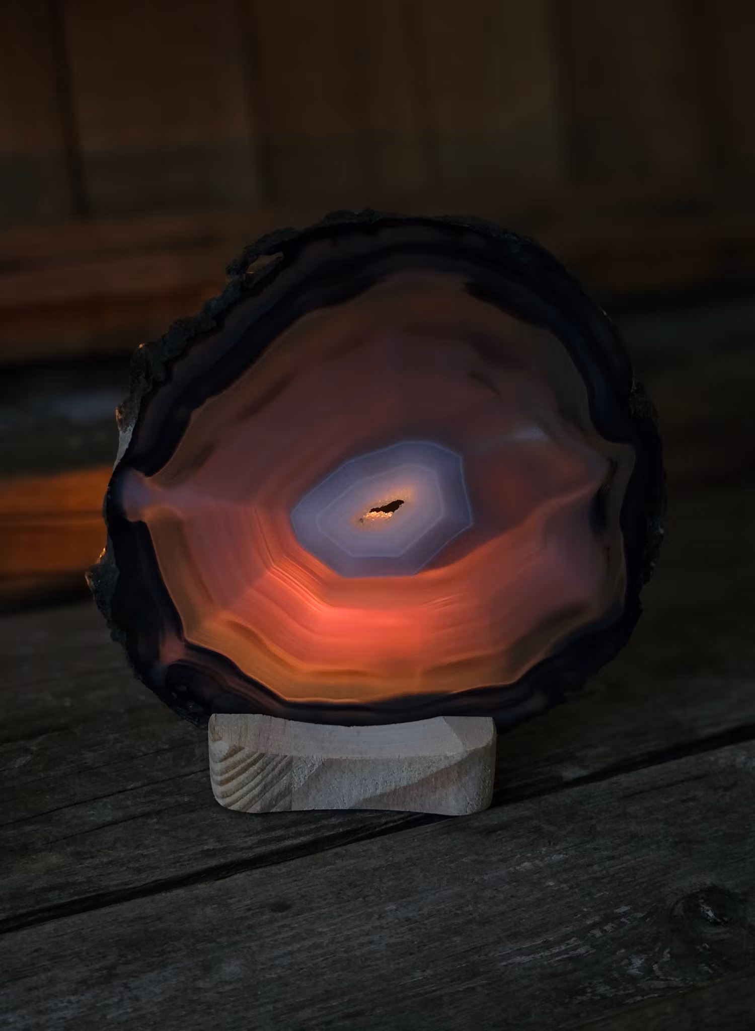 Upptäck vårt eleganta ställ i ljust obehandlat trä, perfekt utformat för att hålla värmeljus och skapa en förtrollande atmosfär tillsammans med en vacker Agatskiva. När ljuset strålar genom kristallen, sprider det ett mjukt och harmoniskt sken som förvandlar vilket rum som helst till en oas av lugn.