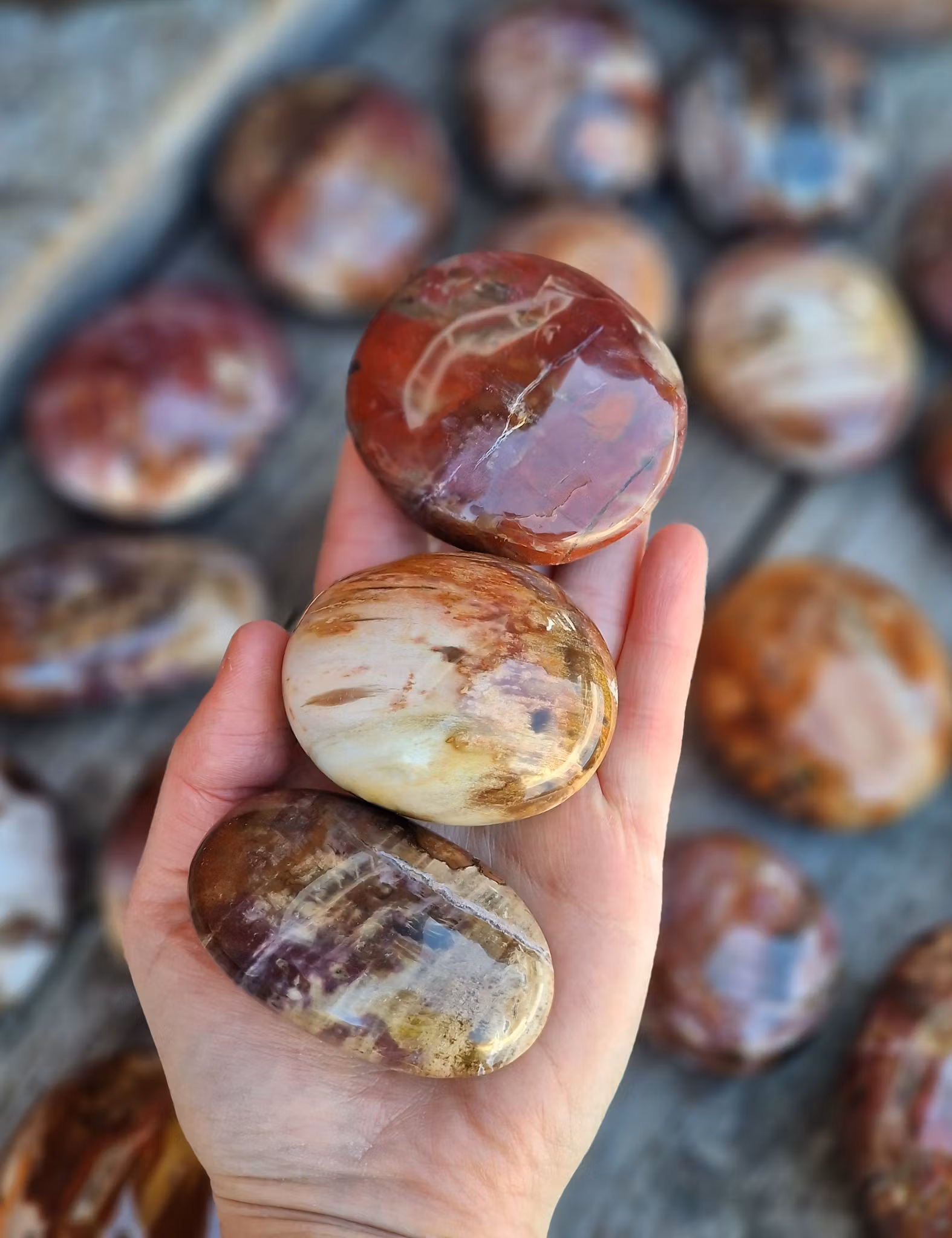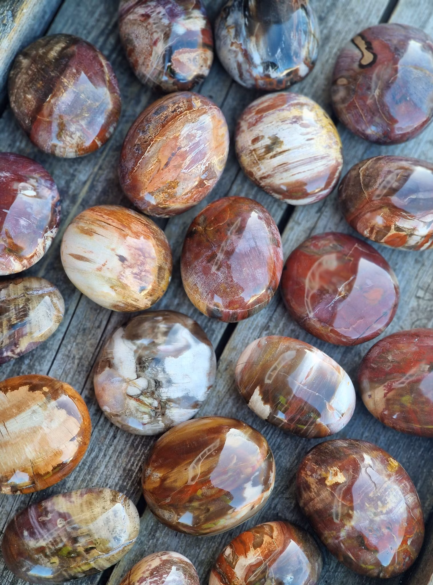 Underbar stor polerad sten av Förstenat trä i superfin kvalité, så kallad touchstone eller handsten. Säljes styckvis. Förstenat trä bildas i en långsam mineraliseringsprocess där allt organiskt material har ersatts av mineral. Du köper en slumpvis liknande kristall enligt text & bild ovan. De skiftar i utseende. Tänk på att kristaller kommer från naturen & naturliga sprickor & ojämnhet kan förekomma. Färger kan skilja sig beroende på hur ljuset faller ner på kristallen samt även mellan olika bildskärmar m.m.