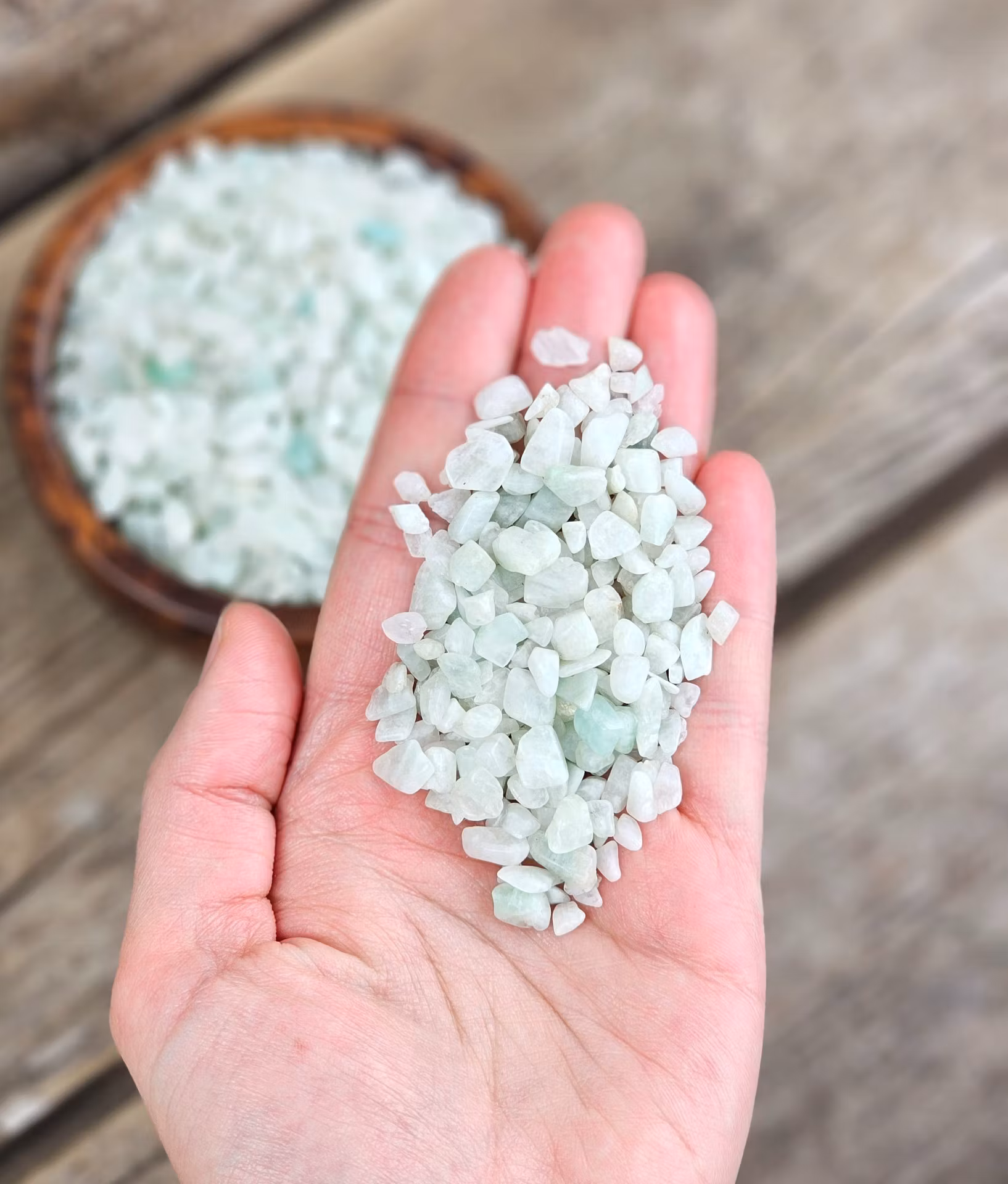 Mycket fina små trumlade mini-stenar, så kallade kristallchips, av Amazonit. Ljus fin modell, lite transparenta stenar! Säljes per påse med 50 gram, vilket är mängden som visas på bilden med påse i handen. De skiftar i utseende & form. Du köper slumpvis liknande kristaller enligt text & bild ovan. Tänk på att kristaller kommer från naturen & naturliga sprickor & ojämnheter kan förekomma. Färger kan skilja sig beroende på hur ljuset faller ner på kristallen samt även mellan olika bildskärmar m.m.