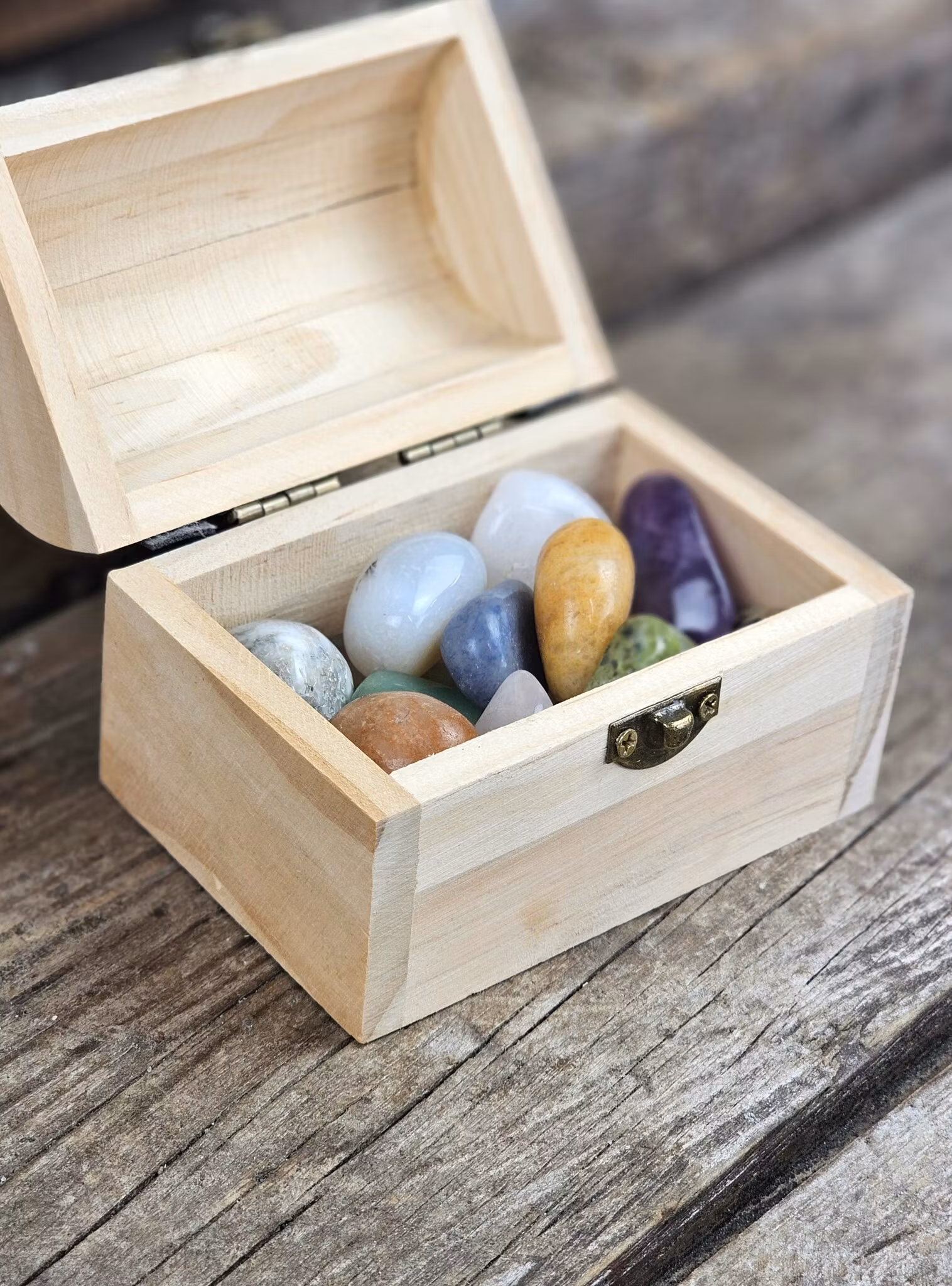 Ursprung: de trumlade stenarna i kistan kan variera mellan våra trumlade stenmixer från t.ex. Afrika och Indien men även Brasilien, Mexiko m.m. Och samtliga kommer utan namn.