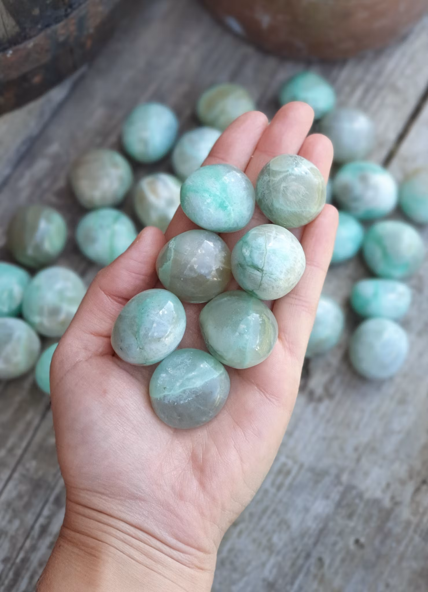 Mycket vackra stora cuddlestones i Garnierit (Grön Månsten)! Så härliga exemplar. De skiftar i utseende. Vikt ca. 25-35 gram. Mått ca. 2.5-3 cm. Säljes styckvis. Du köper slumpvis liknande kristall enligt text & bild ovan. Tänk på att kristaller kommer från naturen & naturliga sprickor & ojämnheter kan förekomma. Färger kan skilja sig beroende på hur ljuset faller ner på kristallen samt även mellan olika bildskärmar m.m.