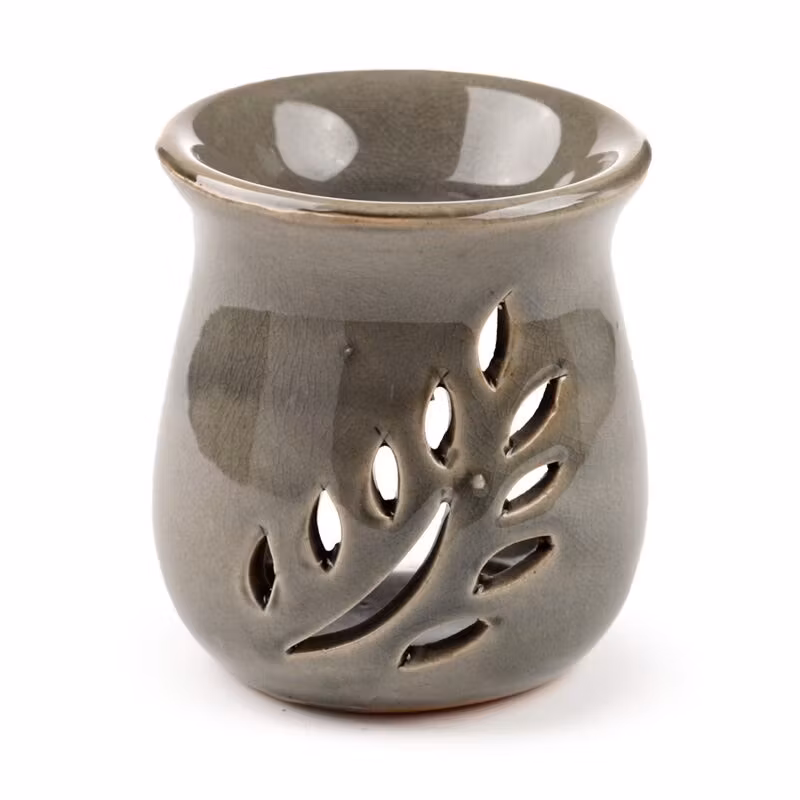 En mjuk och neutral aromalampa i grå keramik med utskuret bladmönster som släpper igenom varmt ljus. Passar alla rum och inredningsstilar. Används med doftolja eller doftvax/melts för en mild och behaglig doftspridning. Säljs styckvis.