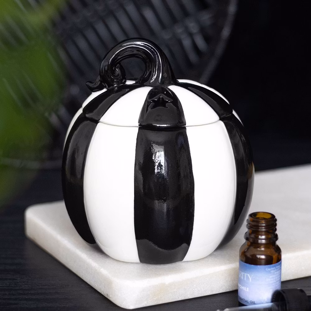 Oljebrännare / Aromalampa – Randig Pumpa (Black & White Striped Pumpkin), doftspridare i keramik