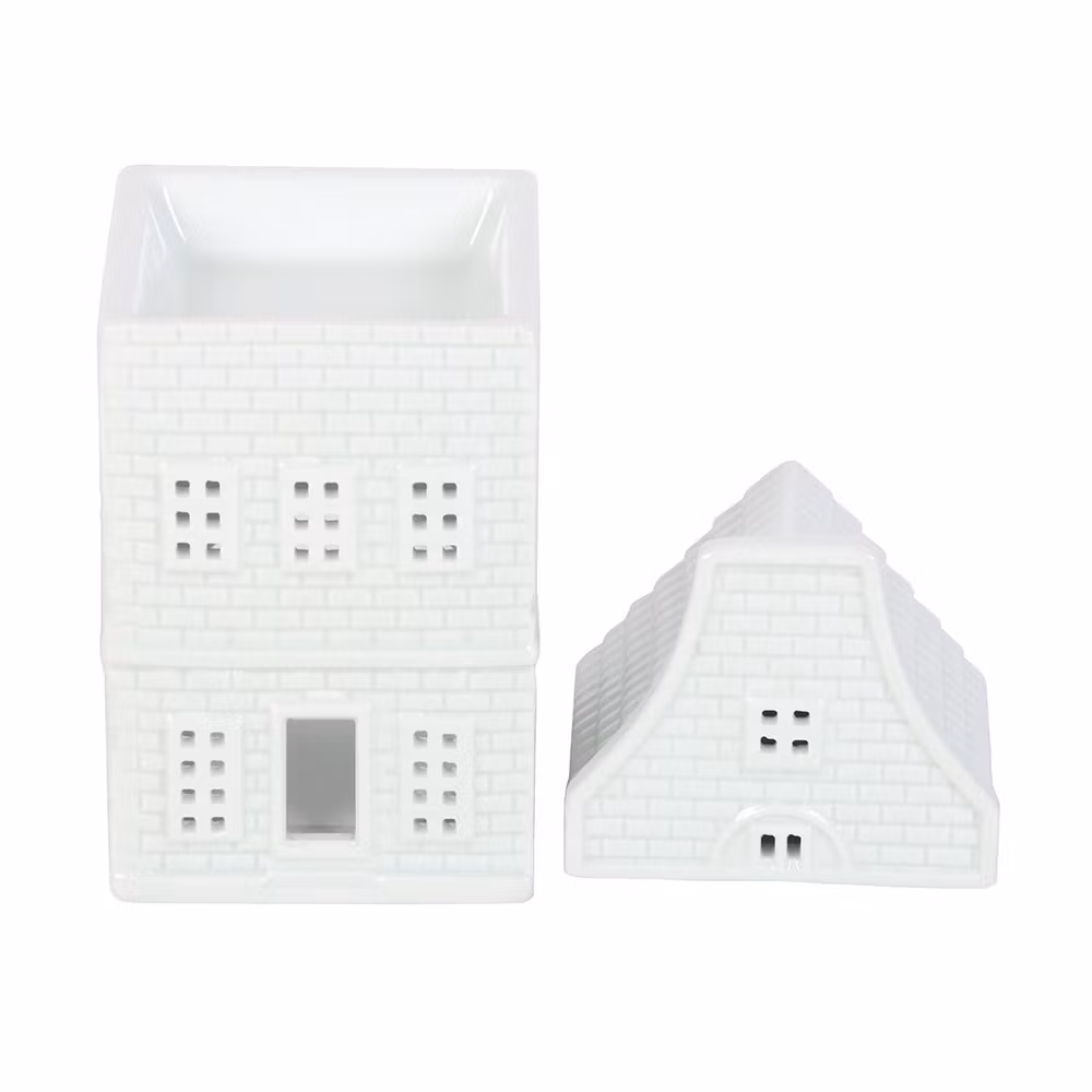 Skapa en varm och inbjudande stämning med denna charmiga oljebrännare formad som ett vitt nordiskt hus. Tillverkad i keramik – perfekt för att sprida säsongens dofter i hemmet. Fyll skålen med vatten och några droppar aromaolja med ett tänt värmeljus under, eller använd doftvax. En stilren detalj som passar i alla rum. Säljs styckvis.