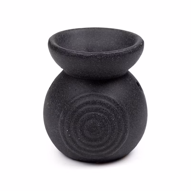 En djup och rogivande oljebrännare i matt svart keramik med cirkelformat zenmönster. Perfekt för kvällsritualer, meditation eller stunder av stillhet. Används med doftolja eller doftvax/melts för en mjuk doftspridning. Säljs styckvis.
