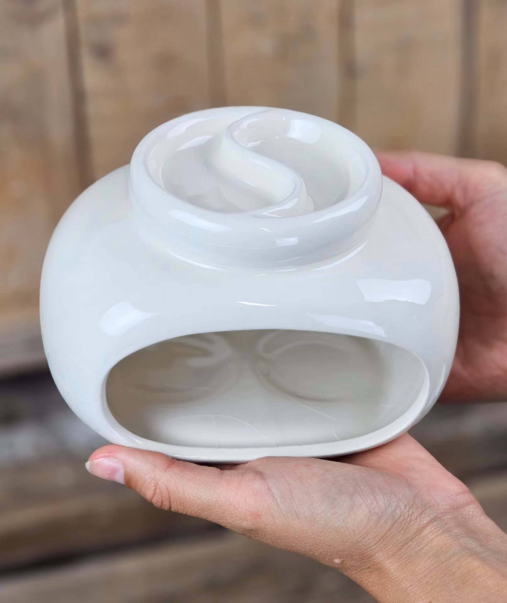 Oljebrännare i enkel elegans gjord av keramik i en cremevit färg med fantastisk funktion då du kan experimentera och kombinera två av dina favoritoljor på samma gång i varsitt fack. Denna diffuser är det traditionella sättet att sprida dofter i hemmet. Skålen upptill fylls med vatten och du droppar därefter i några droppar valfri aromaolja (ca. 3-8 droppar olja ungefär, beror på varje specifik sort samt önskad effekt). Med hjälp av värmeljuset undertill värms vatten-oljeblandningen varsamt upp och den läckra doften sprider sig i hela rummet. En väldoftande, trevlig atmosfär skapas där du kan ta fördel av olika dofters egenskaper inom aromaterapi. Denna produkt passar även med aromavax. Placeras på en värmetålig plats. Rör inte eller flytta den under användning, den blir mycket varm. Lämna aldrig tända ljus obevakade. Håll utom räckhåll från barn och djur. Säljes styckvis. Doftoljor ingår ej, köpes separat i vår butik. Rengörs med fuktad trasa och mild såpa, produkten tål ej maskindisk eller mikrovågsugn. Du köper en oljebrännare enligt text & bild ovan. Färger kan skilja sig beroende på hur ljuset faller ner på produkten samt även mellan olika bildskärmar m.m.