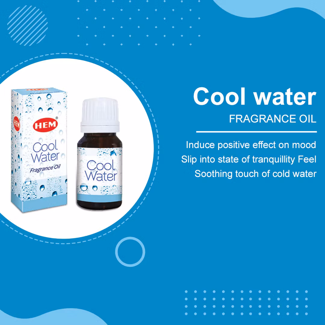 Doft: Cool Water. HEM Cool Water är en blandning av doftoljor som kommer att framkalla en doft som kan ha positiva effekter på humör, fysisk och kognitiv prestation. Denna doft erbjuder det ultimata tillståndet av lugn precis som en lugnande touch av kallt vatten.