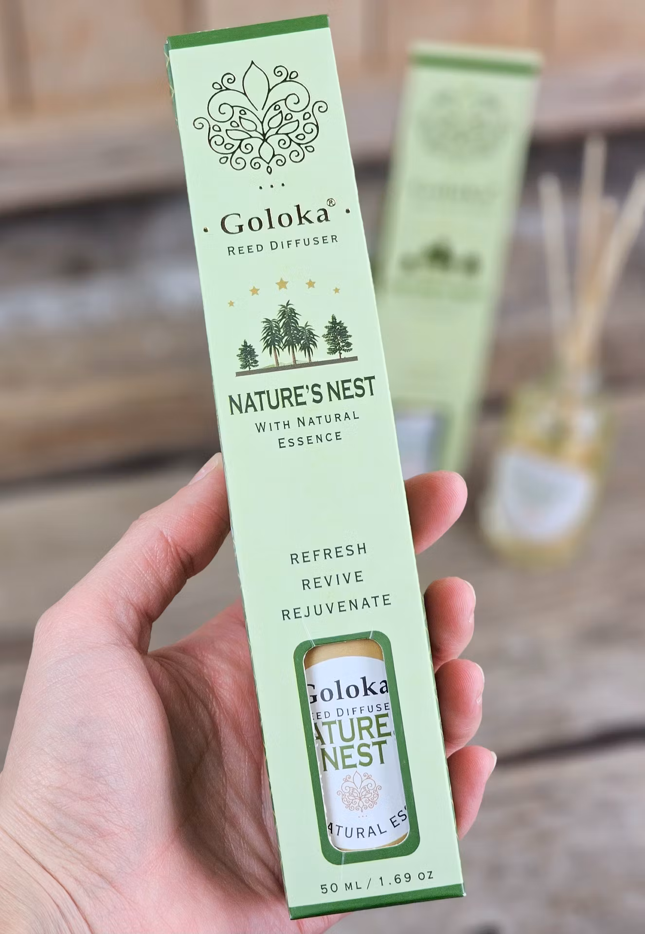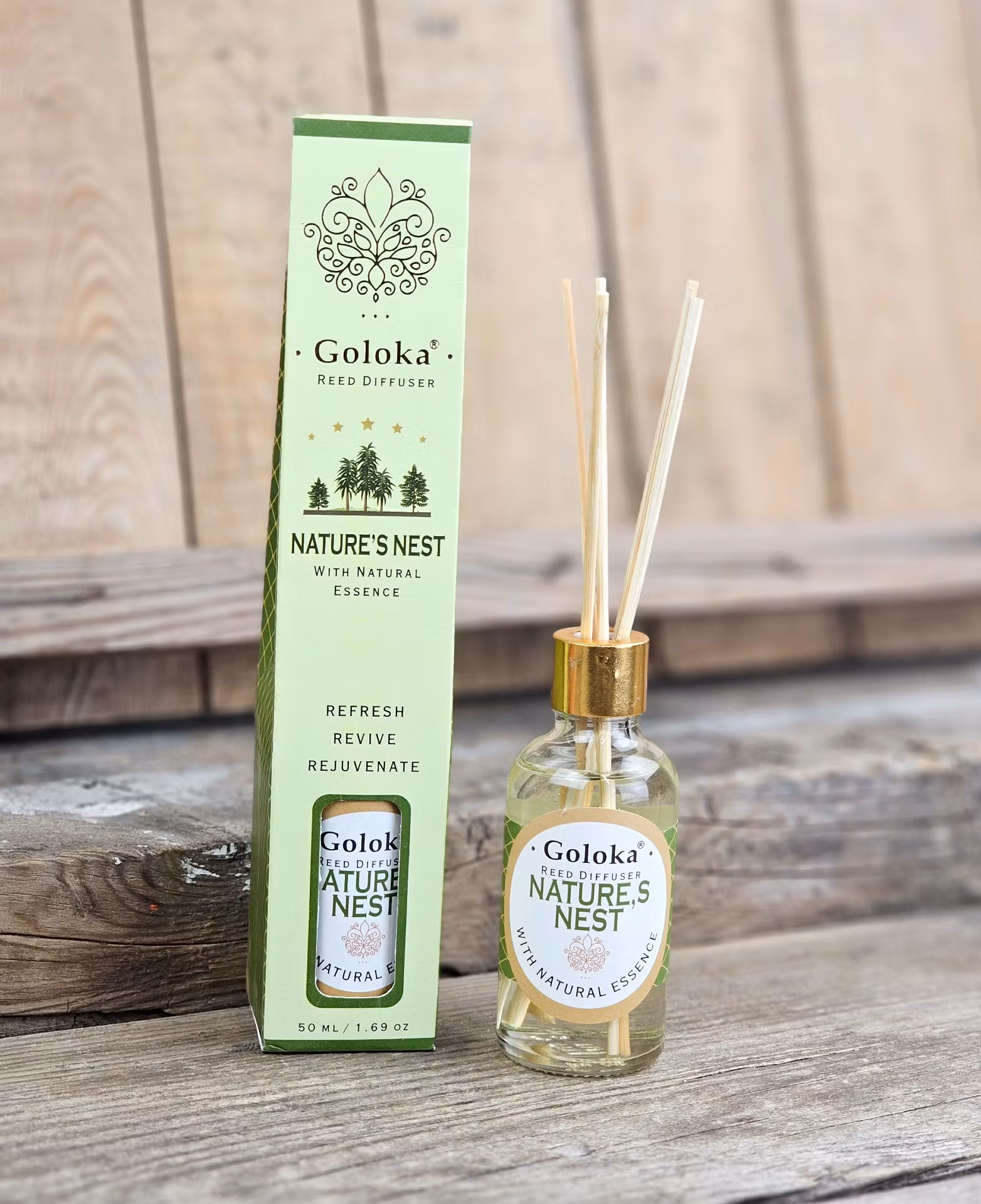 Doft: Nature's Nest. Fräsch och söt med milda inslag av trä. Lugnar och tillför ny energi. Skapar en skön atmosfär för avkoppling. Denna fina doft ingåri Goloka's Nature-serie som även finns hos oss som rökelsepinnar och backflow-koner.