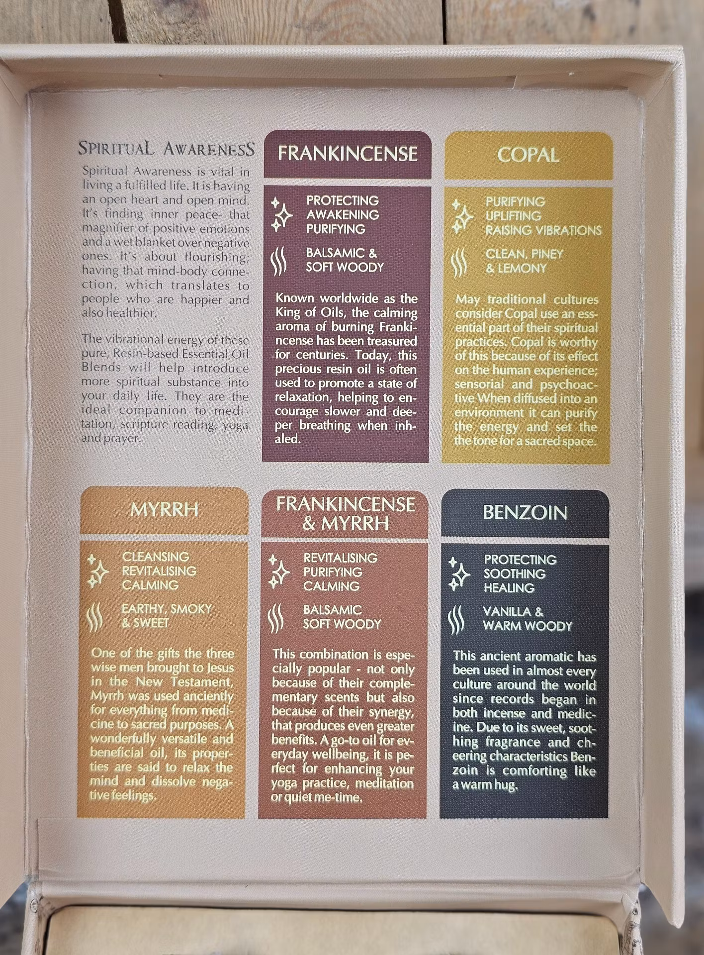 Doftset: Frankincense, Copal, Myrrh, Frankincense & Myrrh (blend) samt Benzoin Resin (blend).