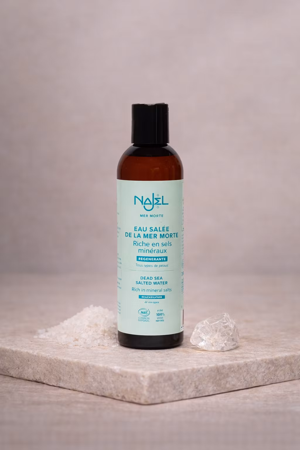 Najel Döda Havets mineralvatten är rikt på 21 naturliga mineraler, bland annat magnesium, kalium och kalcium. Mineralvattnet är känt för sina lugnande, renande och vårdande egenskaper och används ofta i kroppsvård och spa-inspirerade hudvårdsrutiner. Säljs styckvis.