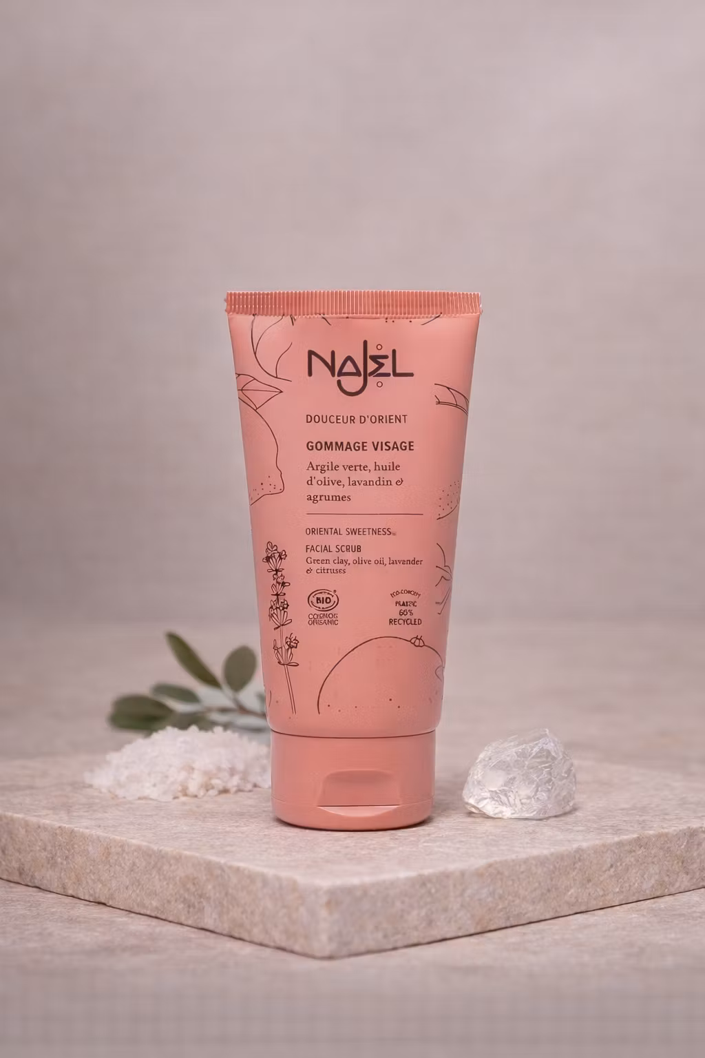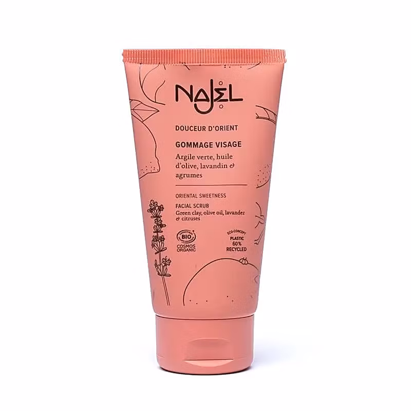 Najel ekologisk ansiktsskrubb rengör huden skonsamt och hjälper till att avlägsna överskott av talg samtidigt som hudens struktur känns jämnare och klarare. Kombinationen av grön lera och olivolja bidrar till en mild exfoliering som passar alla hudtyper. Säljs styckvis.