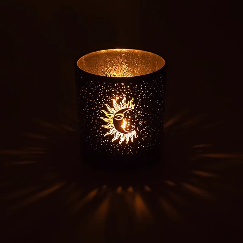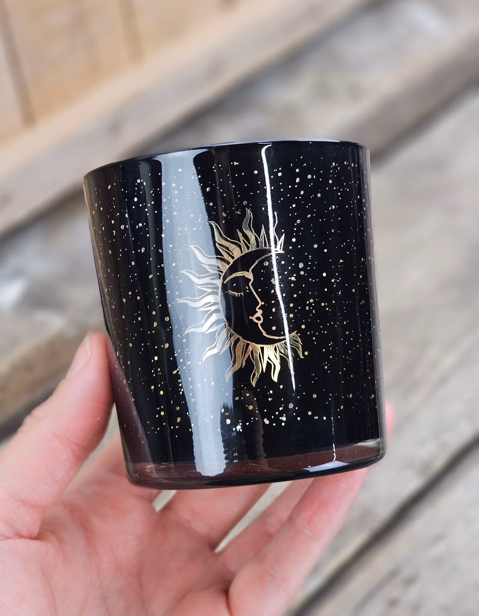 Ljuslykta i glas – Svart med Solen & Månen (Liten)