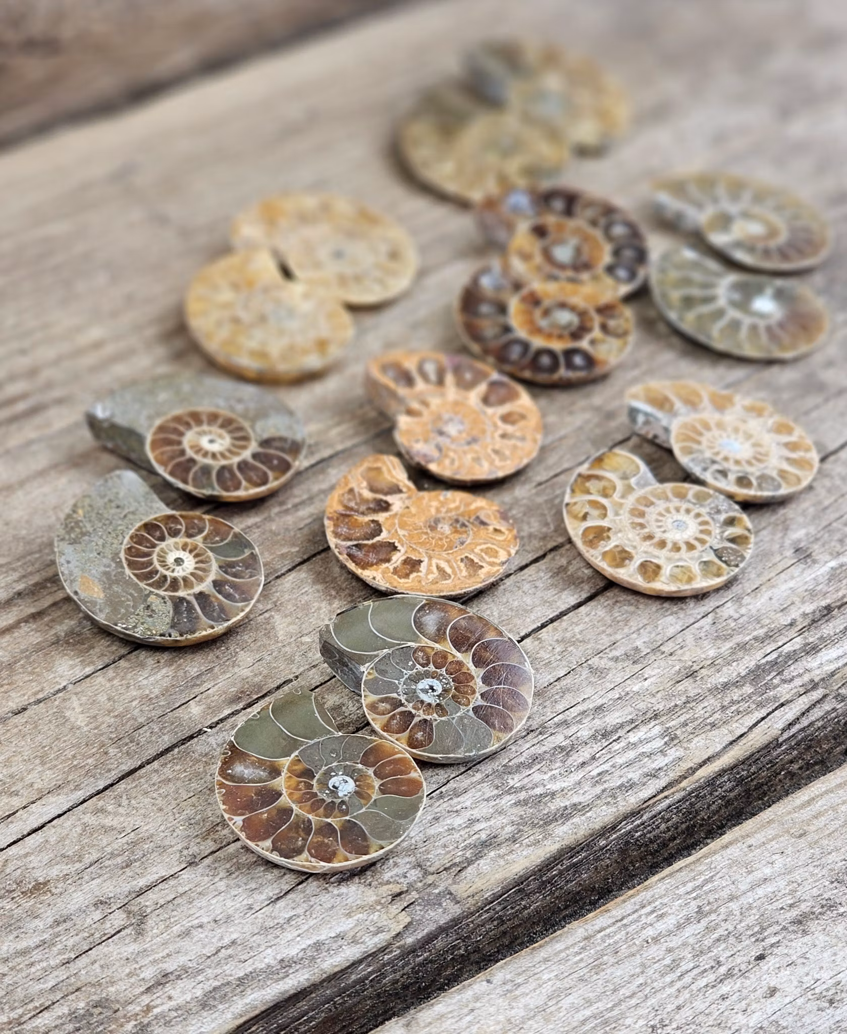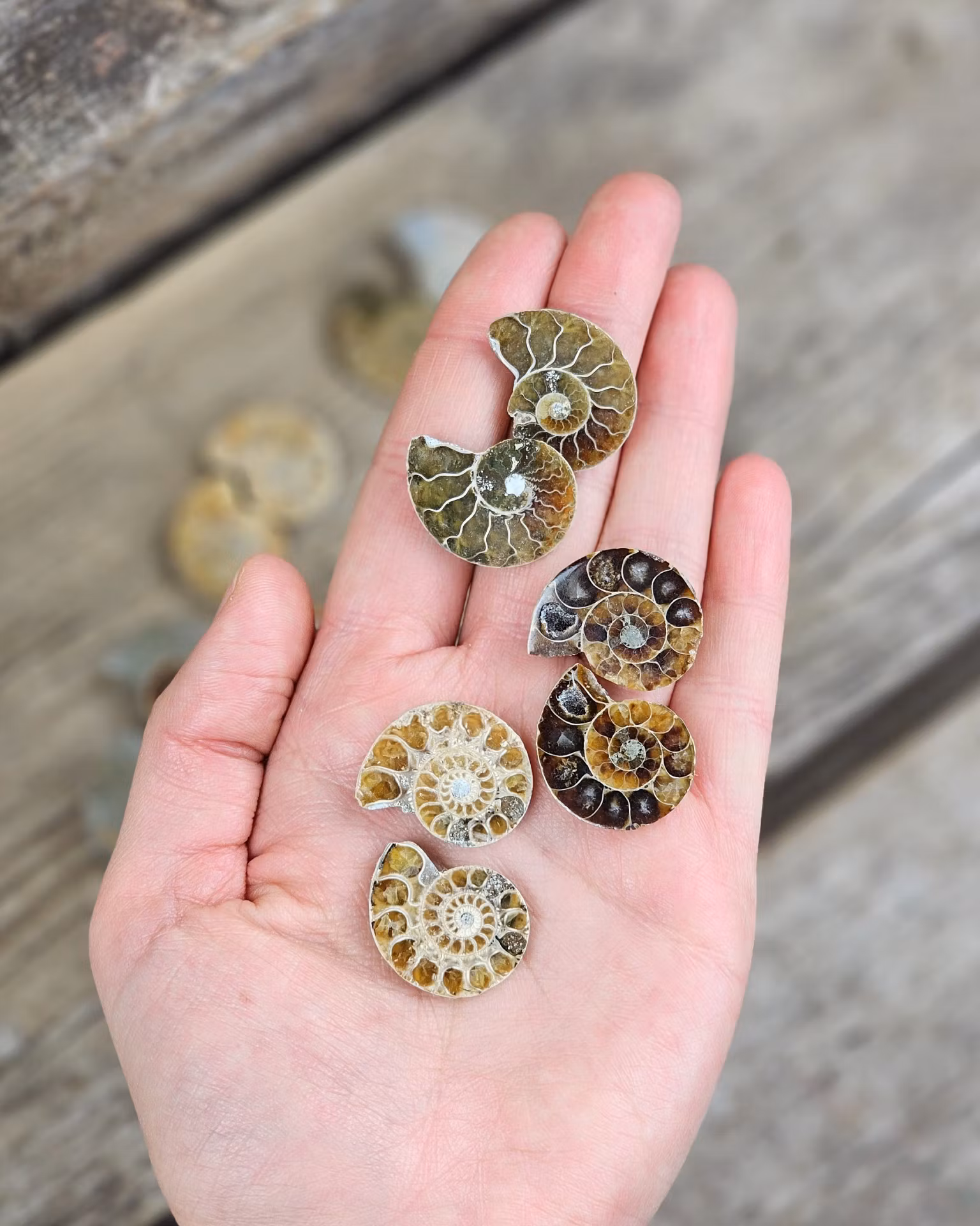 Mycket fina små Ammoniter i par med till viss del opaliserad effekt. Säljes per par. Ammonit är en utdöd underklass av bläckfiskar som levde i grunda hav. De levde från ungefär 400 till 65 miljoner år sedan ända från tidiga devon fram till översta krita. Du köper slumpvis liknande fossil enligt text & bild ovan. Tänk på att kristaller och fossiler kommer från naturen & naturliga sprickor & ojämnheter kan förekomma. Färger kan skilja sig beroende på hur ljuset faller ner på produkten samt även mellan olika bildskärmar m.m.