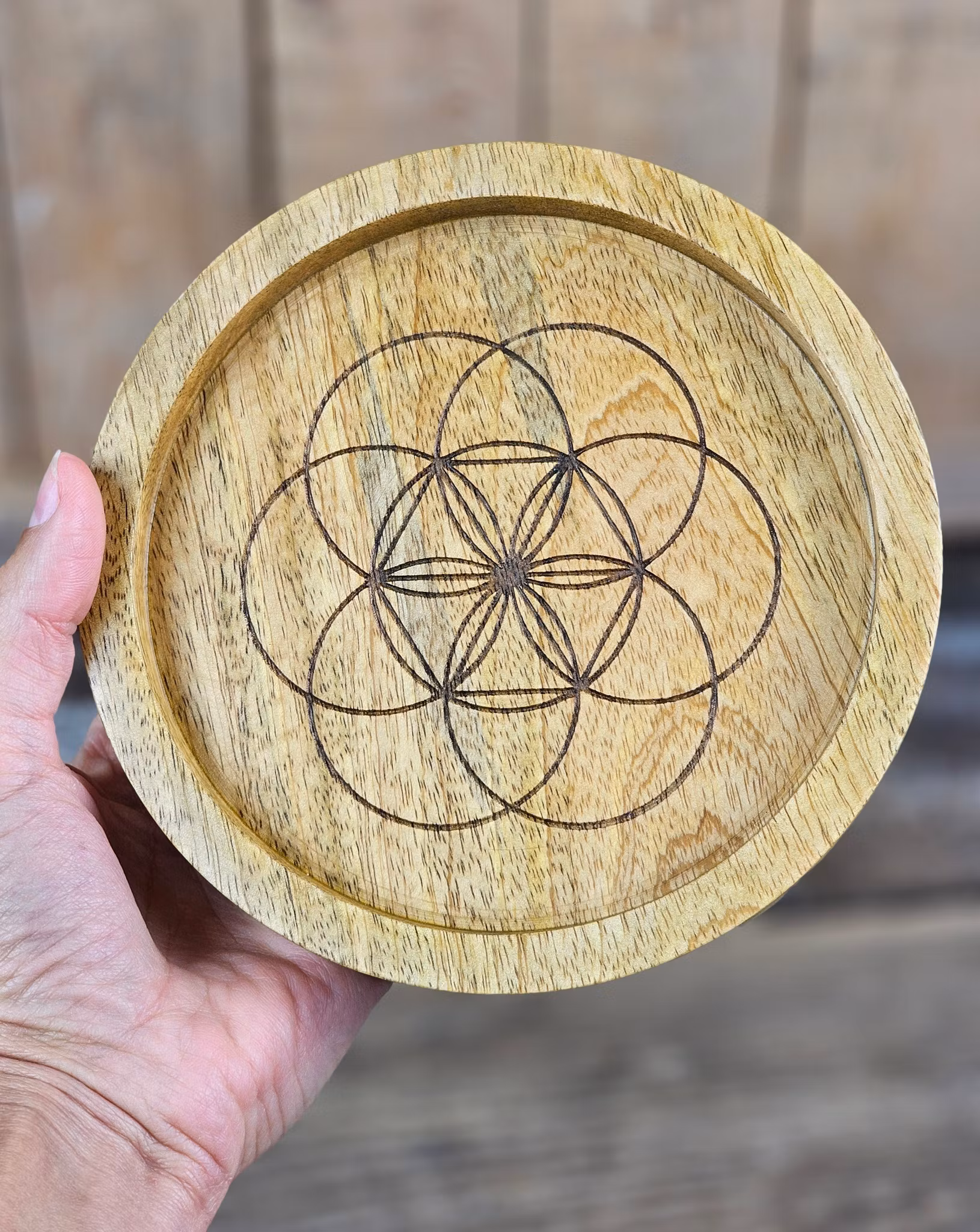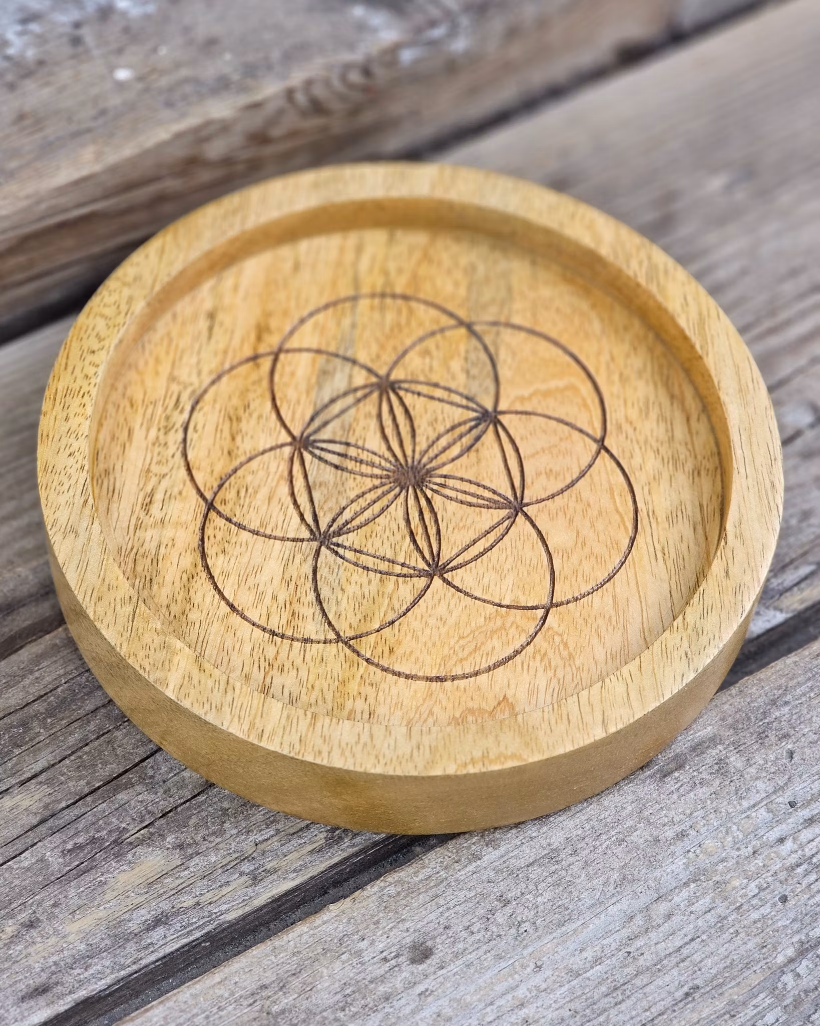Vacker bricka i mangoträ med symbolen Seed Of Life (Livets frö), perfekt att använda när du skapar kristallnät (så kallade grids). Dessa mindre grids på 15 cm är utmärkta att använda ihop med trumlade stenar av mindre storlek! Du placerar din intention i kristallerna och aktiverar kristallnätet du vill jobba med. Den passar precis lika bra att använda som en vacker bricka för dekoration till dina kristaller eller smycken. Säljes styckvis, kristaller ingår ej. Du köper en bricka enligt text & bild ovan. Små skillnader kan förekomma i produktens utseende på grund av dess naturmaterial. Färger kan skilja sig beroende på hur ljuset faller ner på produkten samt även mellan olika bildskärmar m.m.