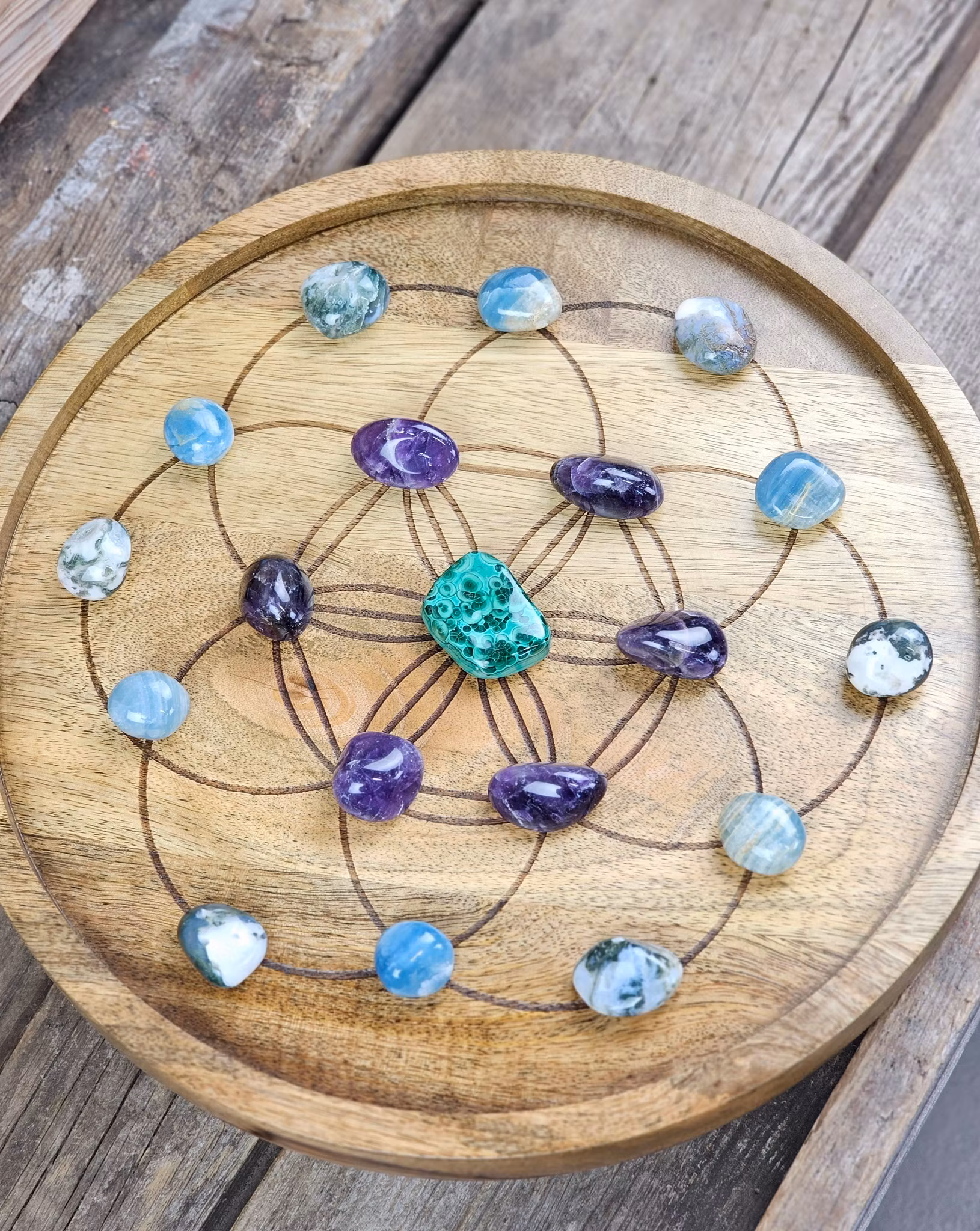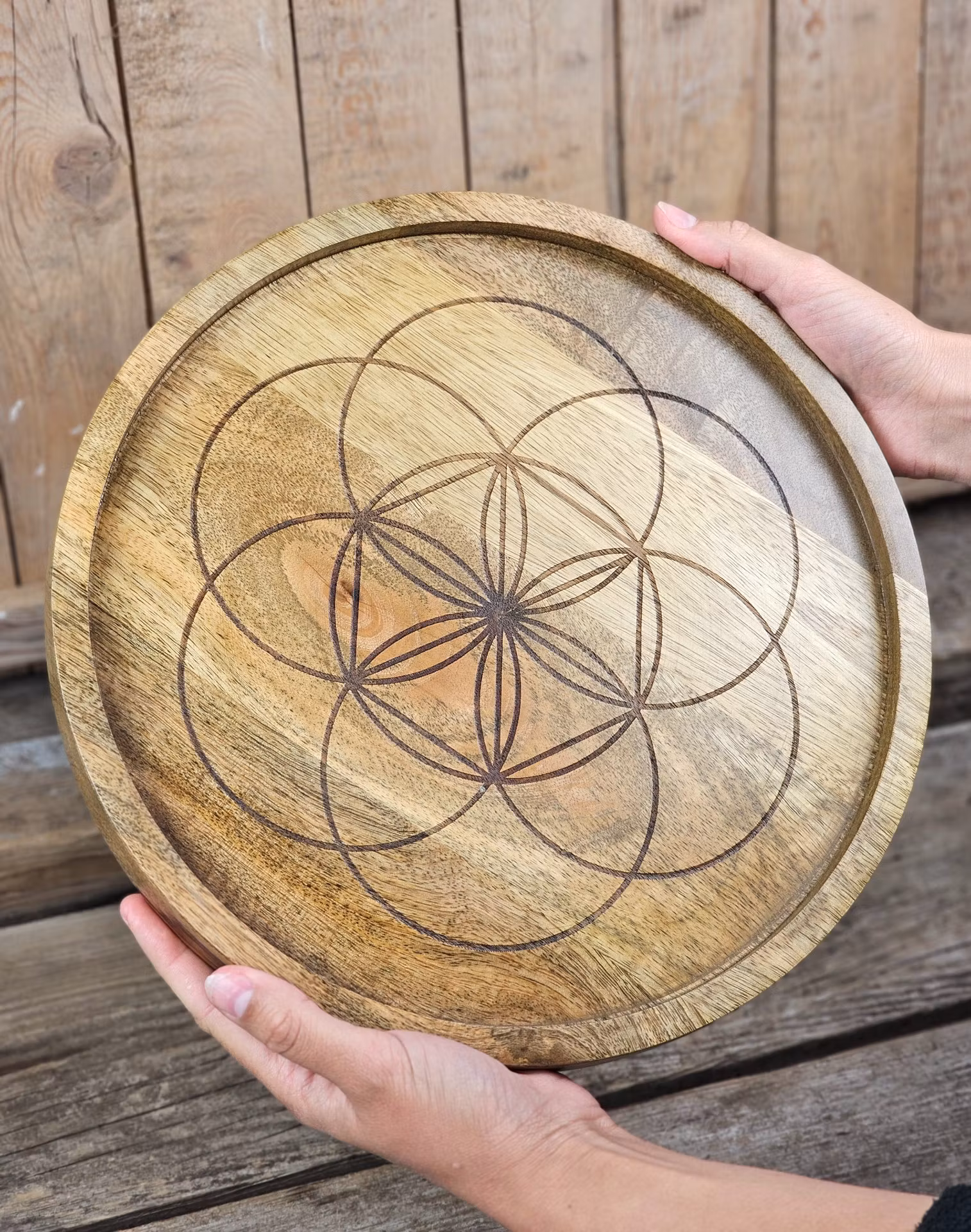 Vacker och lyxig stor bricka i mangoträ med symbolen Seed Of Life (Livets frö). Med två funktioner då det dels är en underbar bricka att dekorera med men även är helt perfekt att använda när du skapar kristallnät (så kallade grids). Du placerar din intention i kristallerna och aktiverar kristallnätet du vill jobba med. Passar precis lika bra att använda som en vacker bricka för dekoration till dina kristaller eller smycken! Säljes styckvis, kristaller ingår ej. Du köper en bricka enligt text & bild ovan. Små skillnader kan förekomma i produktens utseende på grund av dess naturmaterial. Färger kan skilja sig beroende på hur ljuset faller ner på produkten samt även mellan olika bildskärmar m.m.