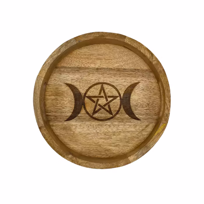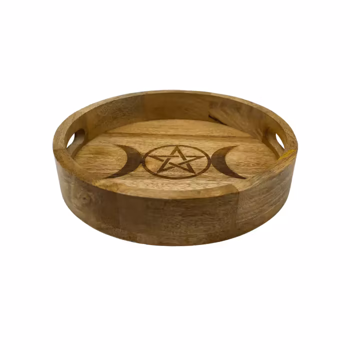 Mycket vacker lyxig bricka med månfaserna ihop med en stjärna i mitten, tillverkad i mangoträ. Stjärnan kan ses som en Pentagram-symbol, känt inom mystiken som en magisk symbol som symboliserar bland annat gudinnedyrkan och det heliga kvinnliga. Perfekt till dina kristaller, smycken och andra vackra ting. Säljes styckvis, kristaller/smycken/oljor ingår ej. Du köper en bricka enligt text & bild ovan. Små skillnader kan förekomma i produktens utseende på grund av dess naturmaterial. Färger kan skilja sig beroende på hur ljuset faller ner på produkten samt även mellan olika bildskärmar m.m.