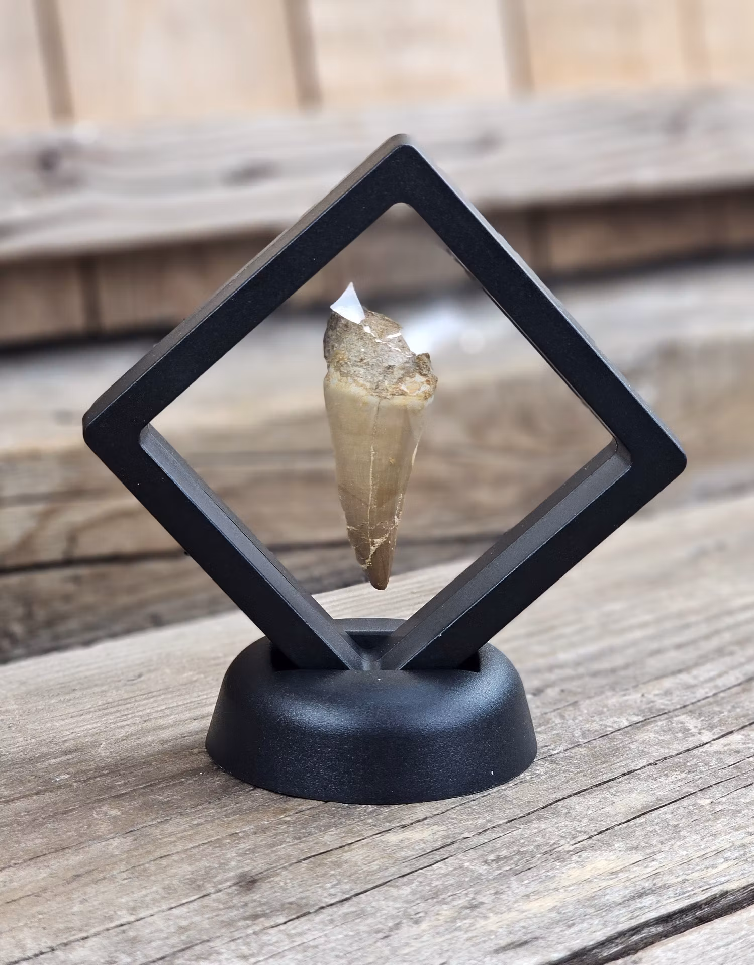 Mycket fint samlarobjekt av Mosasaurus tand. Mosasaurus var den största marina reptilen och levde under Maastricht, den sista åldern av Kritaperioden. Namnet betyder "ödla från floden Meuse". Namnet härrör från att den hittades nära floden Meuse och har också applicerats på hela gruppen, trots att de hittats över hela världen. Experter tror att de levde nära ytan där den jagade fisk, sköldpaddor och ammoniter m.m. De kunde nå längder på över 14 meter. Från början var Mosasaurus en ödla på land men som flydde ner i vattnet till att utvecklas till en vattenlevande ödla. Miljoner år senare hade Mosasaurus utvecklats till ett av de farligaste djuren någonsin. Upptäck en bit av historia med våra Mosasaurus-tänder, lika spännande för de små som för vuxna. Ett autentiskt och unikt samlarobjekt. Observera att displayen till fossilen ingår ej, dessa köpes separat. Tänk på att kristaller och fossiler kommer från naturen & naturliga sprickor & ojämnhet kan förekomma. Färger kan skilja sig beroende på hur ljuset faller ner på produkten samt även mellan olika bildskärmar m.m.