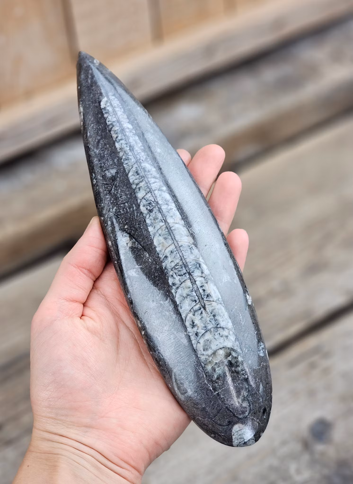 Mycket fin Ortoceratit fossil, ett fint samlarobjekt. Ortoceratit var en typ av bläckfisk som levde under tidig krita, för omkring 400 miljoner år sedan i Paleozoikum. Det är en utdöd art där dess fossil som hittas ligger inbäddade i kalksten (Orthocerida; av grekiskans ortho, 'rak', och keras ; 'horn') Ortoceratiterna hade ett rakt eller svagt svängt, spetsigt skal. Vissa arter kunde nå en längd på upp till 10 meter. Ortoceratiterna antas ha varit snabbsimmande rovdjur som simmade bäst med spetsen framåt, men kunde även simma bakåt.