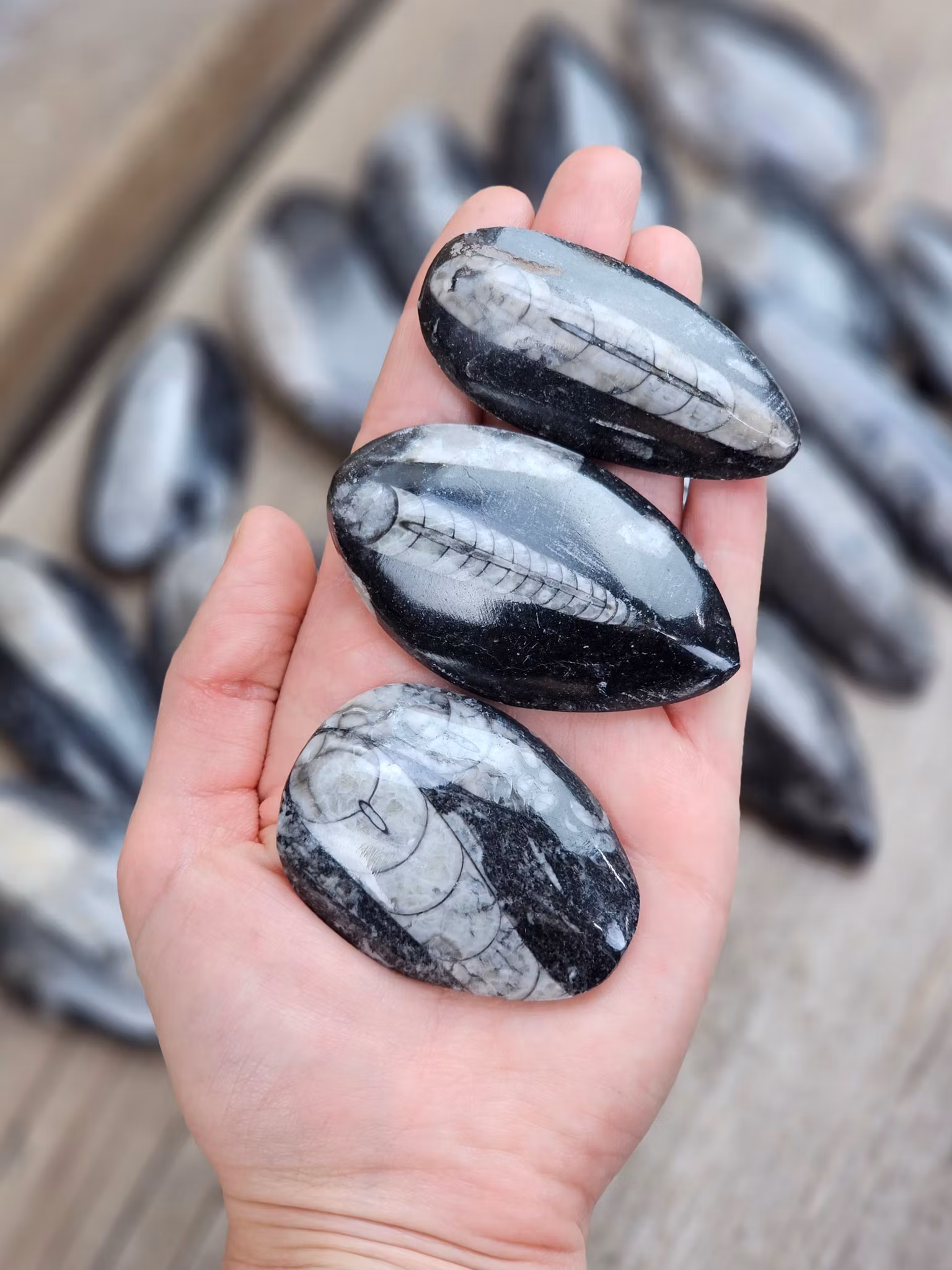 Mycket fin polerad Ortoceratit fossil. Säljes styckvis. Ortoceratit var en typ av bläckfisk som levde under tidig krita, för omkring 400 miljoner år sedan i Paleozoikum. Det är en utdöd art där dess fossil som hittas ligger inbäddade i kalksten (Orthocerida; av grekiskans ortho, 'rak', och keras ; 'horn') Ortoceratiterna hade ett rakt eller svagt svängt, spetsigt skal. Vissa arter kunde nå en längd på upp till 10 meter. Ortoceratiterna antas ha varit snabbsimmande rovdjur som simmade bäst med spetsen framåt, men kunde även simma bakåt.