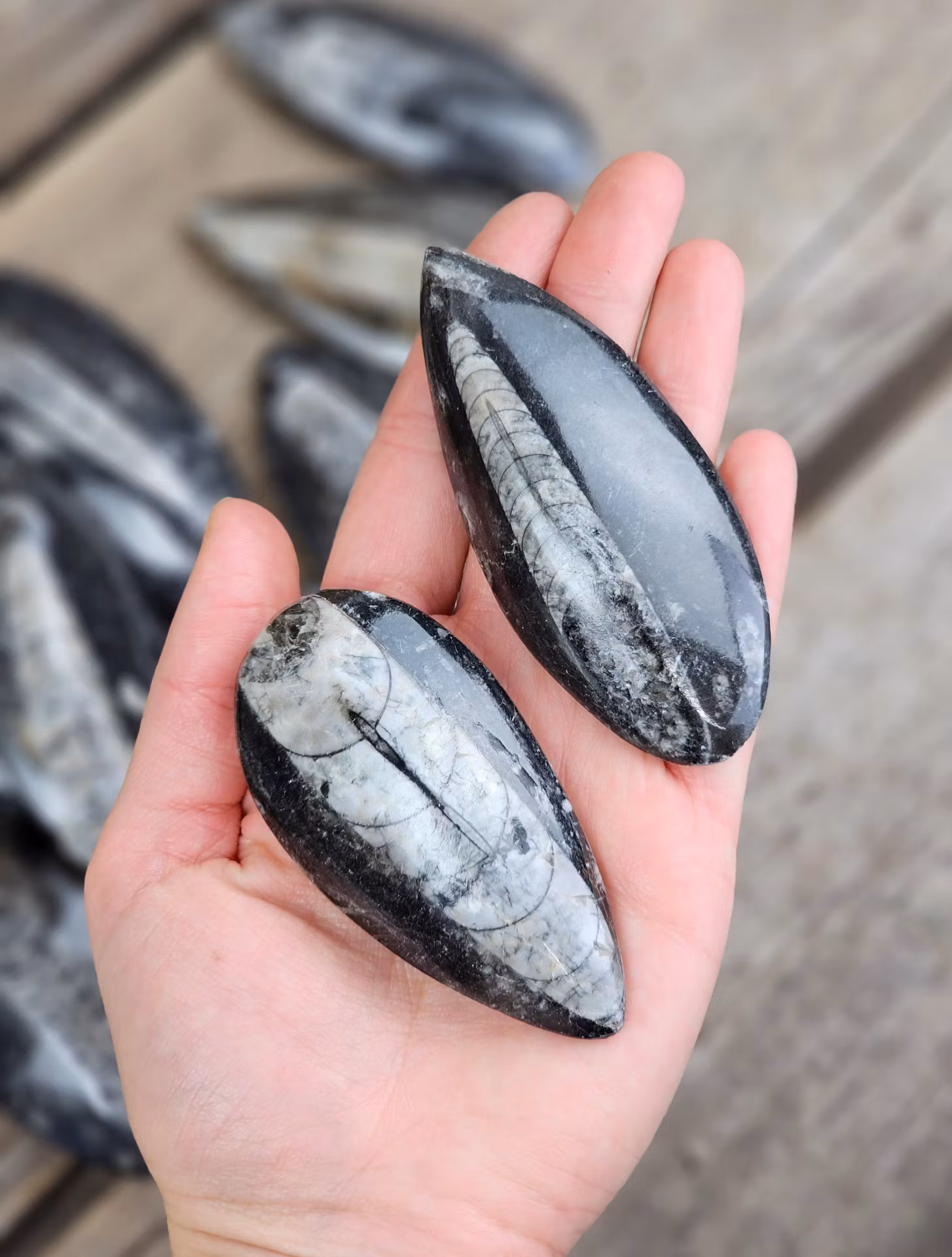 Mycket fin polerad Ortoceratit-fossil med vackra naturliga detaljer. Ett klassiskt samlarobjekt och fin dekoration i hemmet. Du köper ett slumpvis utvalt exemplar i likvärdig kvalitet som på bilderna. Säljs styckvis.