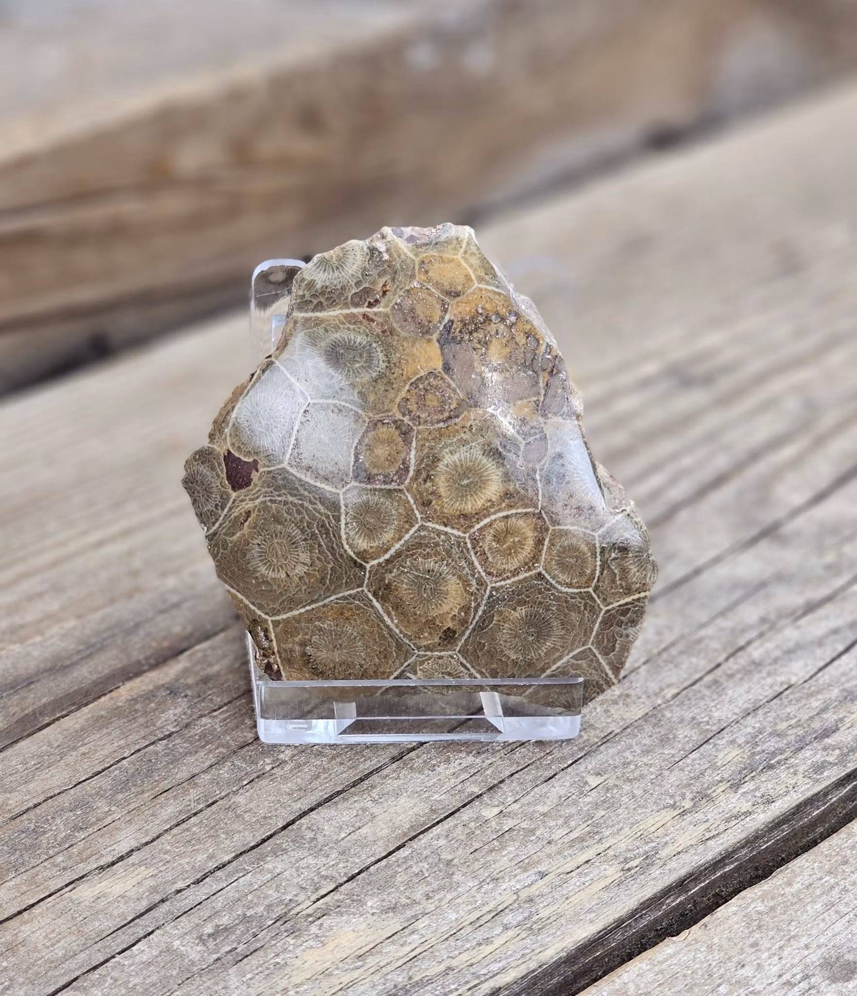 Vackert samlarobjekt i mycket fin kvalité av Hexagonaria, ett släkte av Korall. Ovansidan är polerad medan underdelen är obehandlad. Fossiler av Hexagonaria finns i klippformationer som dateras till devonperioden, för cirka 350-400 miljoner år sedan. Fossiler av detta släkte bildar Petoskey-stenar, vilket är statens sten i Michigan. De allra tidigaste Korallerna uppkom för cirka 540 miljoner år sedan. De var en del av de första ekosystemen i haven. Korallrev av andra moderna arter finns än idag och är en av de mest biologiskt mångfaldiga och produktiva ekosystemen på jorden. Tänk på att kristaller och fossiler kommer från naturen & naturliga sprickor & ojämnhet kan förekomma. Färger kan skilja sig beroende på hur ljuset faller ner på produkten samt även mellan olika bildskärmar m.m.