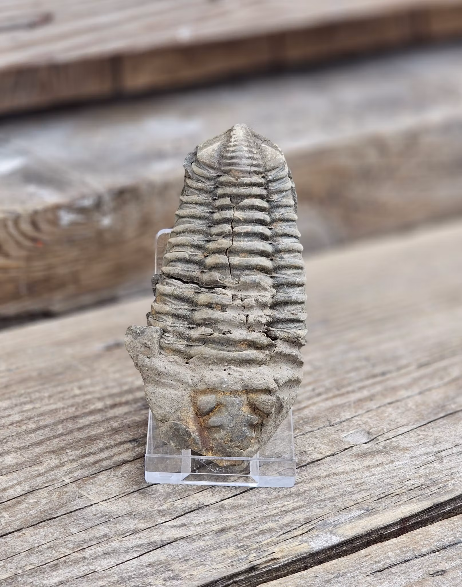 Häftig Trilobit fossil. Trilobiter är en utdöd havslevande djurgrupp som levde under tidsperioderna som sträckte sig emellan Kambrium och Perm. Trilobiter har inga nu levande släktingar. De levde under ca. 270-300 miljoner år och under den tid de fanns utvecklades över 20 000 olika Trilobit-arter. Den forskning som gjorts på Trilobiter har givit värdefull information om förändringar i jordens klimat, miljöförändringar och biologisk mångfald under Paleozoikum-eran. Det fanns arter av Trilobiterna som kunde simma medan andra kröp omkring nere på havsbotten. Vissa arter fanns på djupt vatten medan andra levde i grunda havsvikar. Trilobiter påträffas i sten där andra marina arter som t.ex. urtida koraller förekommer. Varför Trilobiterna dog ut är forskare än idag osäkra kring. Under de geologiska perioder som Trilobiterna levde på vår jord skedde flera omfattande massutdöenden men de följdes även av återhämtning. Trilobiter var en framgångsrik djurgrupp men det slutgiltiga utdöendet skedde i slutet av Perm, under Perm-trias-utdöendet. Det var det största massutdöendet i jordens historia då 96% av alla marina arter och 70% av alla landlevande arter utrotades. Det är mycket troligt att Trilobiterna dog ut på grund av att levnadsvillkoren på jorden blev så pass hårda. De enda spåren av trilobiter som finns i dag är fossil och spårfossil.