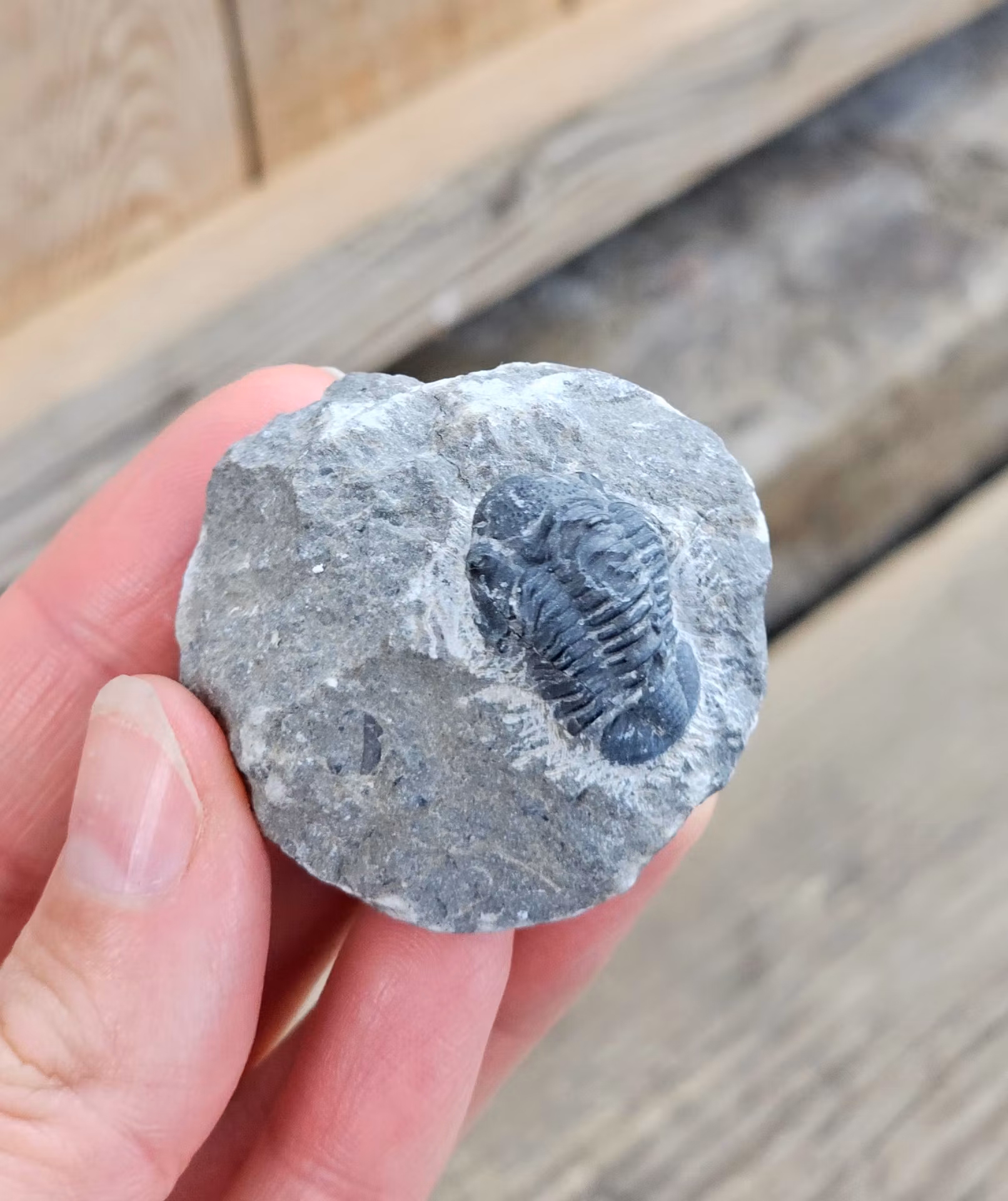Häftig Trilobit Phacops fossil i sin modersten. Trilobit Phacops är ett spektakulärt stycke av historia. Ett unikt exemplar i naturligt skick som är mycket väl bevarat i sin modersten. Trilobit Phacops har en vacker svart färg och har bevarats i minsta detalj, vilket gör att det känns som om dessa Trilobiter simmade över havsbotten senast igår. Trilobiter är en utdöd havslevande djurgrupp som levde under tidsperioderna som sträckte sig emellan Kambrium och Perm. Trilobiter har inga nu levande släktingar. De levde under ca. 270-300 miljoner år och under den tid de fanns utvecklades över 20 000 olika Trilobit-arter. Den forskning som gjorts på Trilobiter har givit värdefull information om förändringar i jordens klimat, miljöförändringar och biologisk mångfald under Paleozoikum-eran. Det fanns arter av Trilobiterna som kunde simma medan andra kröp omkring nere på havsbotten. Vissa arter fanns på djupt vatten medan andra levde i grunda havsvikar. Trilobiter påträffas i sten där andra marina arter som t.ex. urtida koraller förekommer. Varför Trilobiterna dog ut är forskare än idag osäkra kring. Under de geologiska perioder som Trilobiterna levde på vår jord skedde flera omfattande massutdöenden men de följdes även av återhämtning. Trilobiter var en framgångsrik djurgrupp men det slutgiltiga utdöendet skedde i slutet av Perm, under Perm-trias-utdöendet. Det var det största massutdöendet i jordens historia då 96% av alla marina arter och 70% av alla landlevande arter utrotades. Det är mycket troligt att Trilobiterna dog ut på grund av att levnadsvillkoren på jorden blev så pass hårda. De enda spåren av trilobiter som finns i dag är fossil och spårfossil.