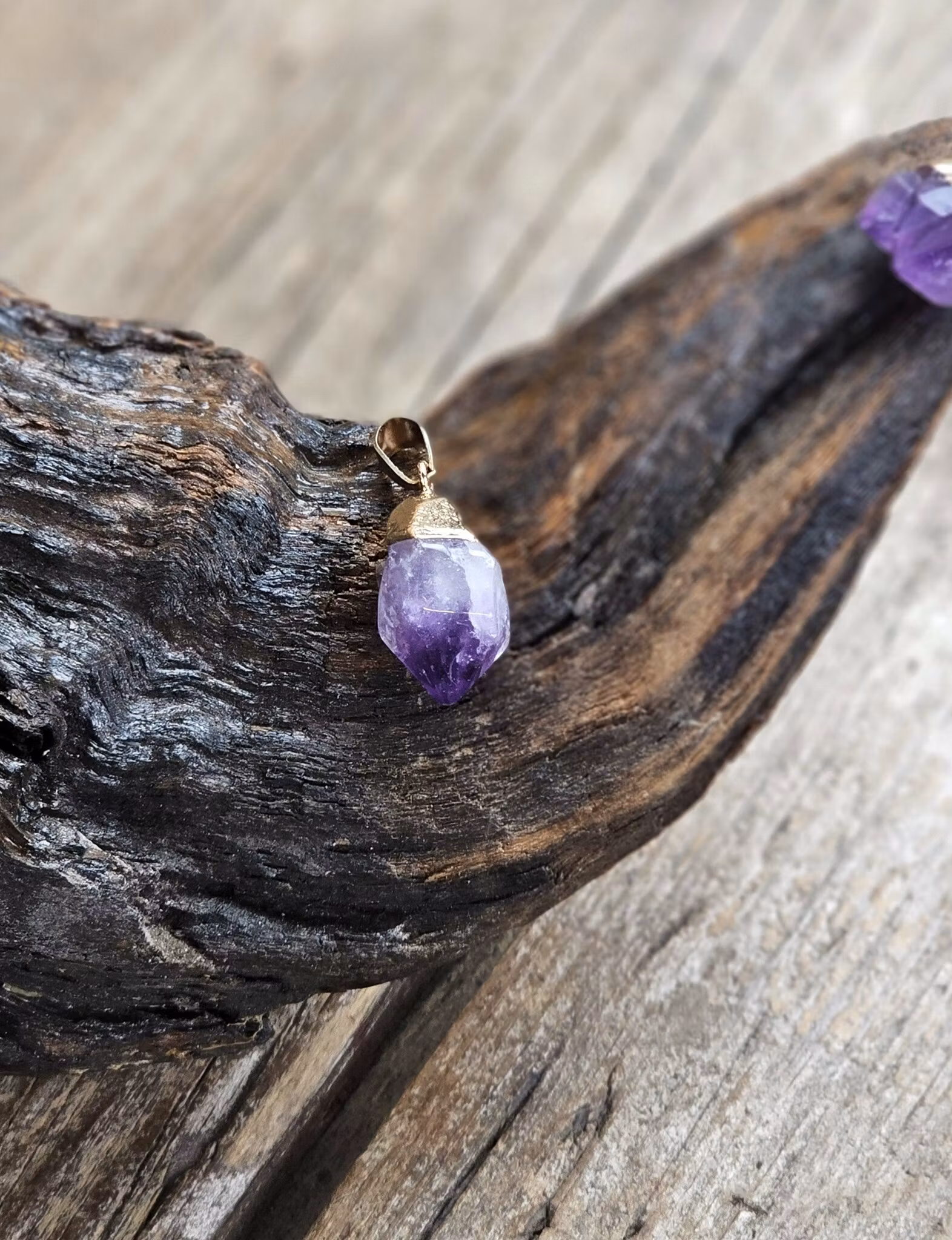 Fint guldpläterat hänge med en vacker polerad Ametistspets/litet kluster. De varierar i utseende. Säljes styckvis. Du köper ett slumpvis liknande smycke enligt text & bild ovan. Tänk på att kristaller kommer från naturen & naturliga sprickor & ojämnheter kan förekomma. Färger kan skilja sig beroende på hur ljuset faller ner på produkten samt även mellan olika bildskärmar m.m.