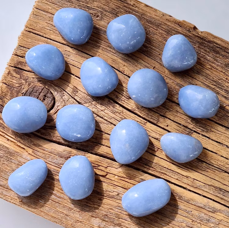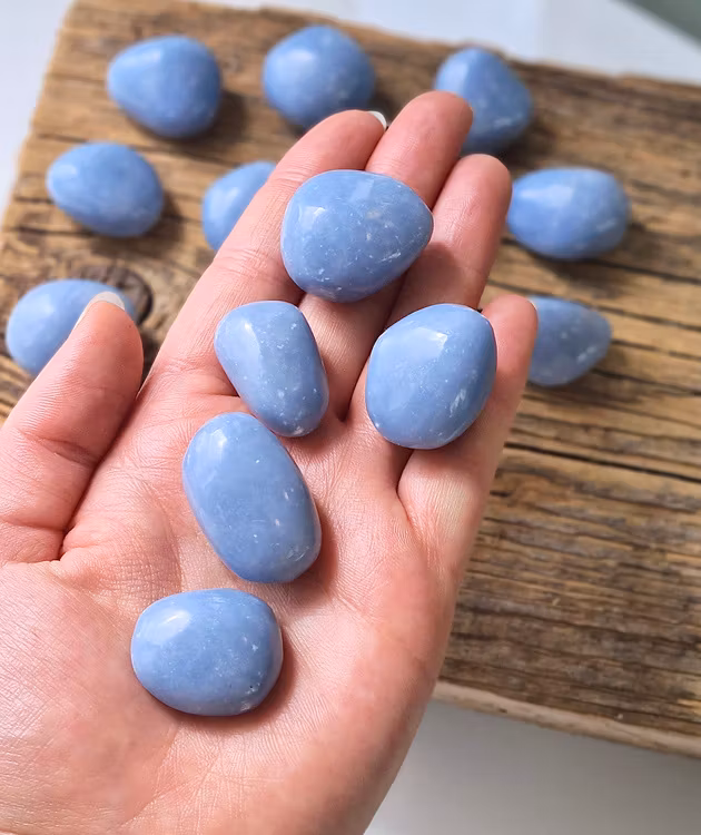 Otroligt vackra trumlade Angelit. De skiftar i utseende. Vikt ca. 7-20 gram. Mått varierar ca. 1-2 cm. Säljes styckvis. Du köper slumpvis liknande kristall enligt text & bild ovan. Tänk på att kristaller kommer från naturen & naturliga sprickor & ojämnheter kan förekomma. Färger kan skilja sig beroende på hur ljuset faller ner på kristallen samt även mellan olika bildskärmar m.m.
