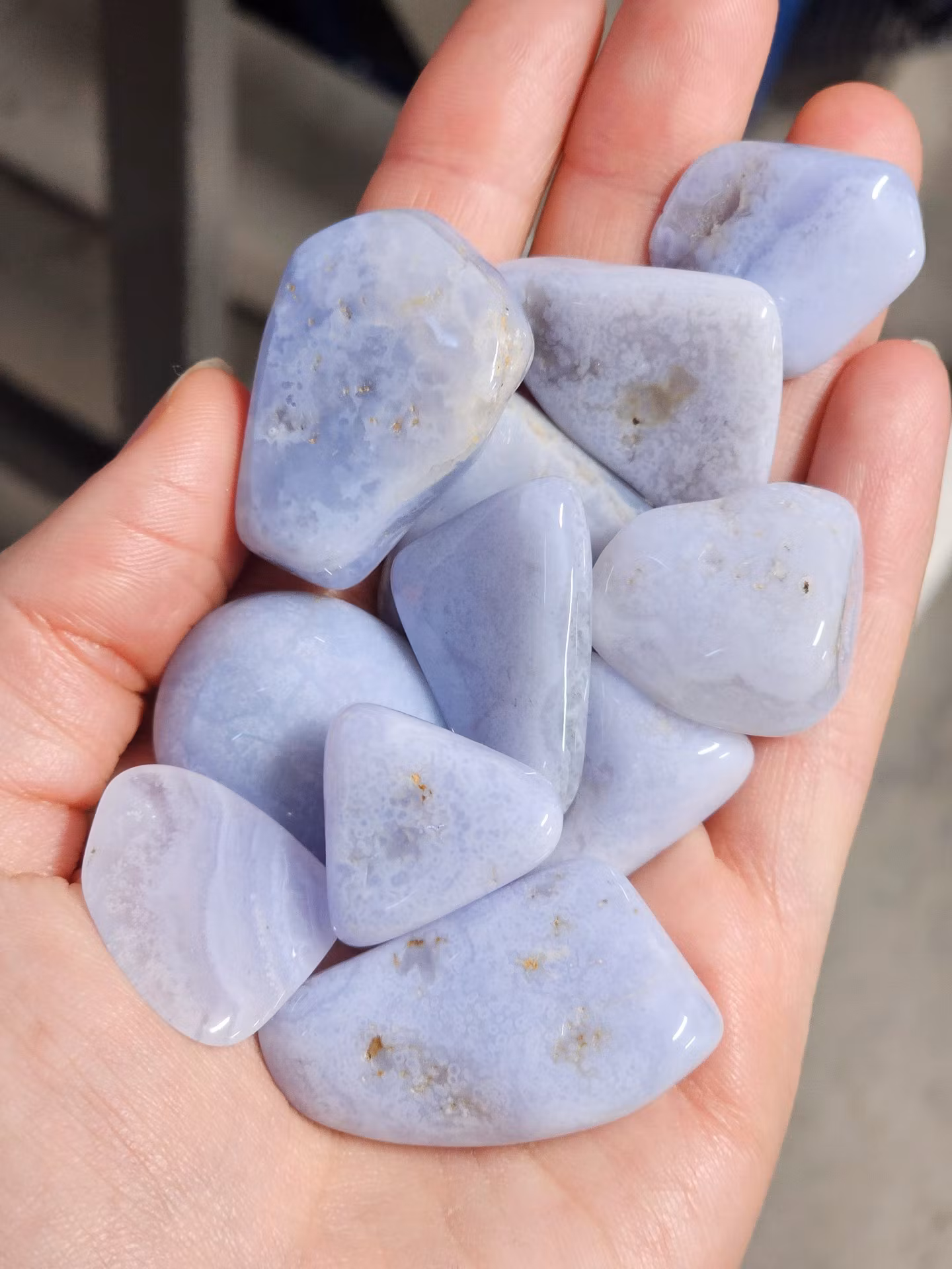 Blå Kalcedon, trumlad -40% fynd avvikande mönster/mindre storlek