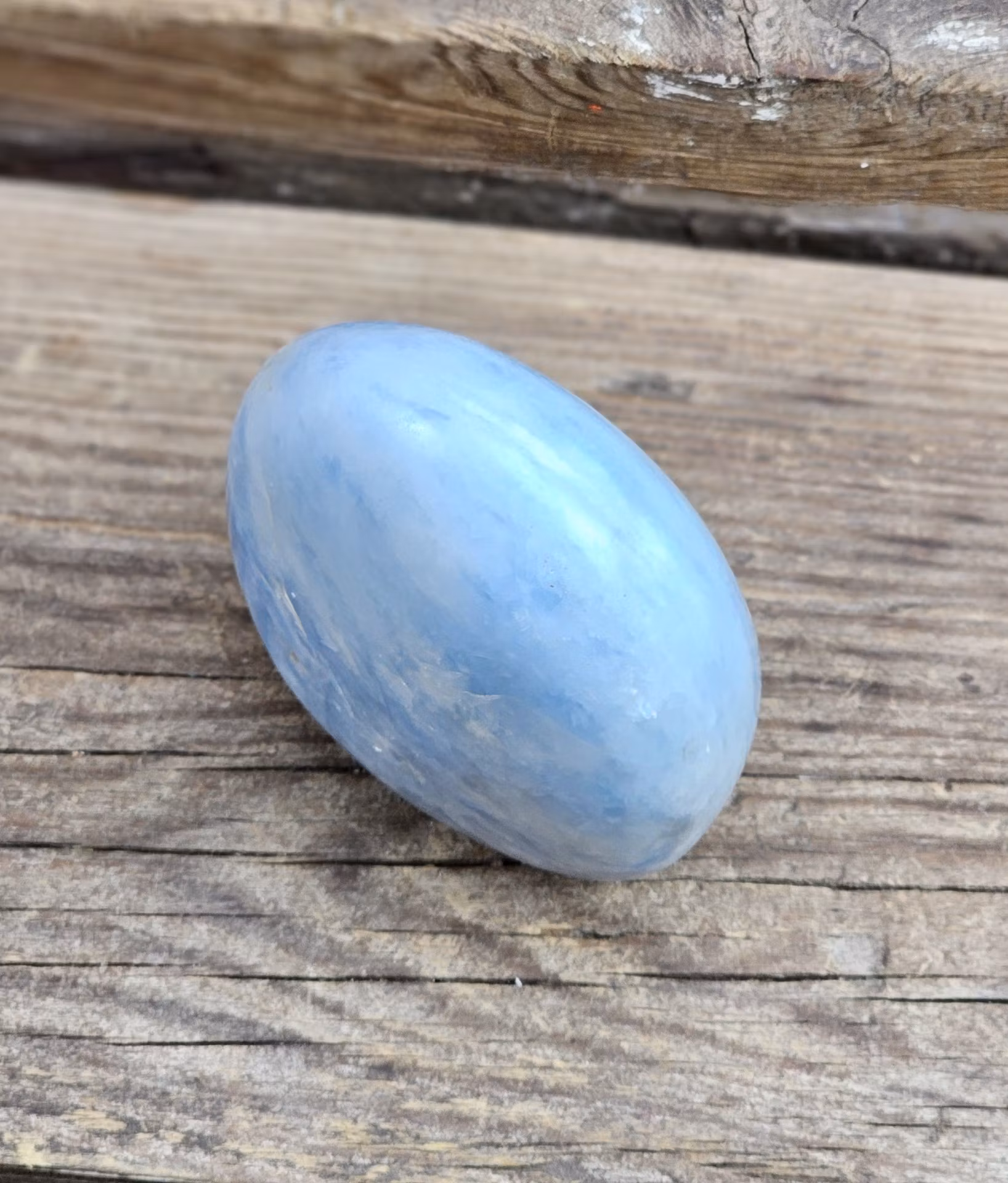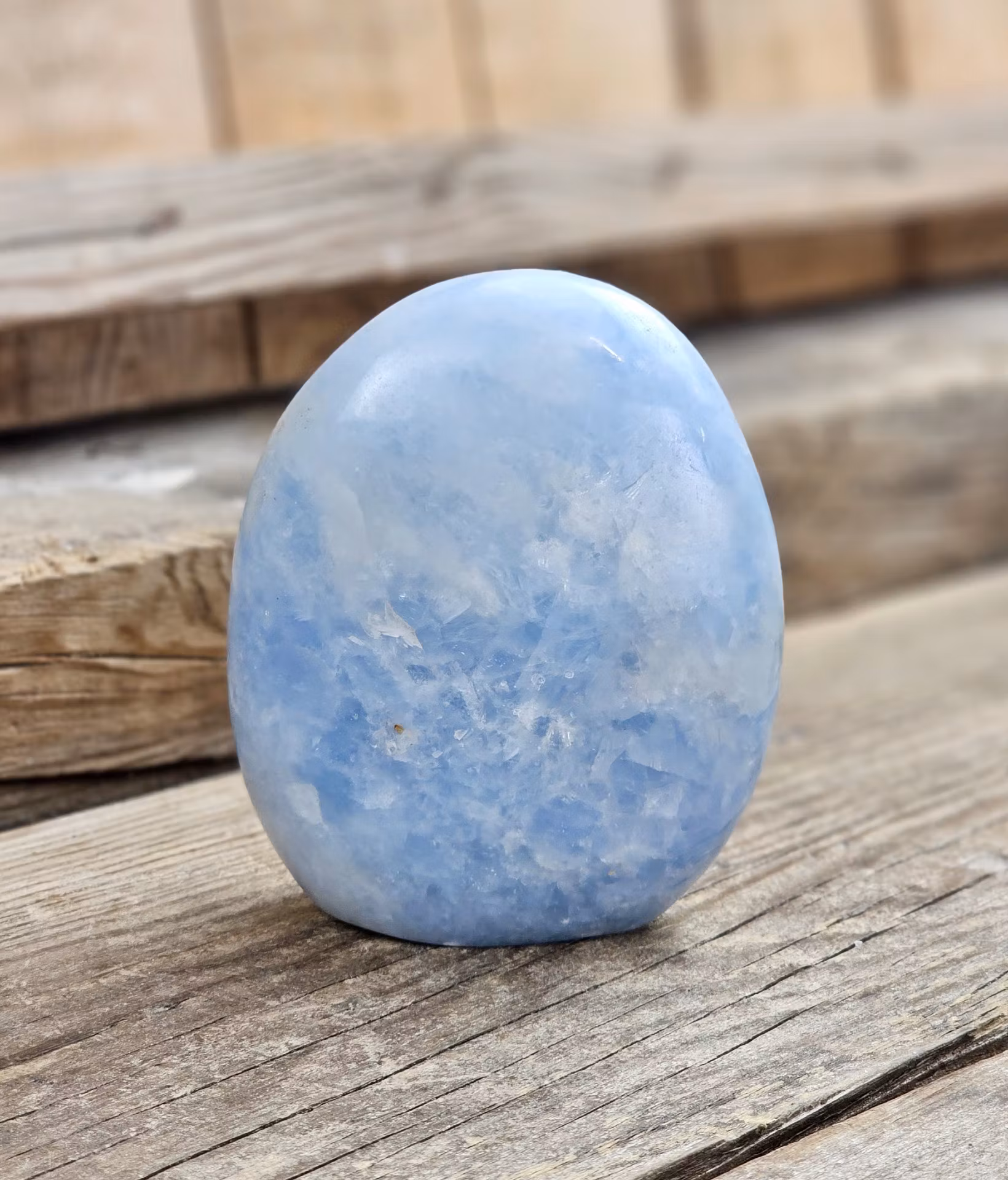 Mycket fin polerad friform i Blå Kalcit med väldigt vacker färg. Finns ett nagg nedtill på ena sidan, därav 30%. Tänk på att kristaller kommer från naturen & naturliga sprickor & ojämnhet kan förekomma. Färger kan skilja sig beroende på hur ljuset faller ner på kristallen samt även mellan olika bildskärmar m.m.