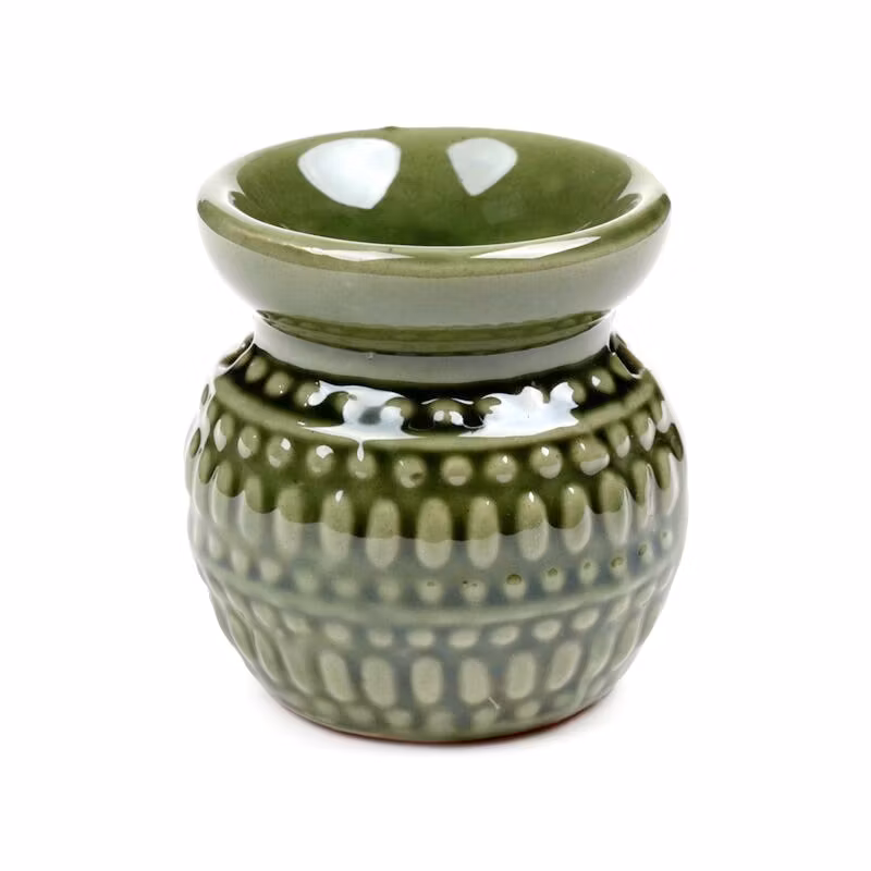 En varm och jordnära oljebrännare i olivgrön keramik med mjukt bandat mönster. Skapa lugn stämning hemma vid stunder av återhämtning, meditation eller kvällsro. Används med doftolja eller doftvax/melts för en mjuk doftspridning. Säljs styckvis.